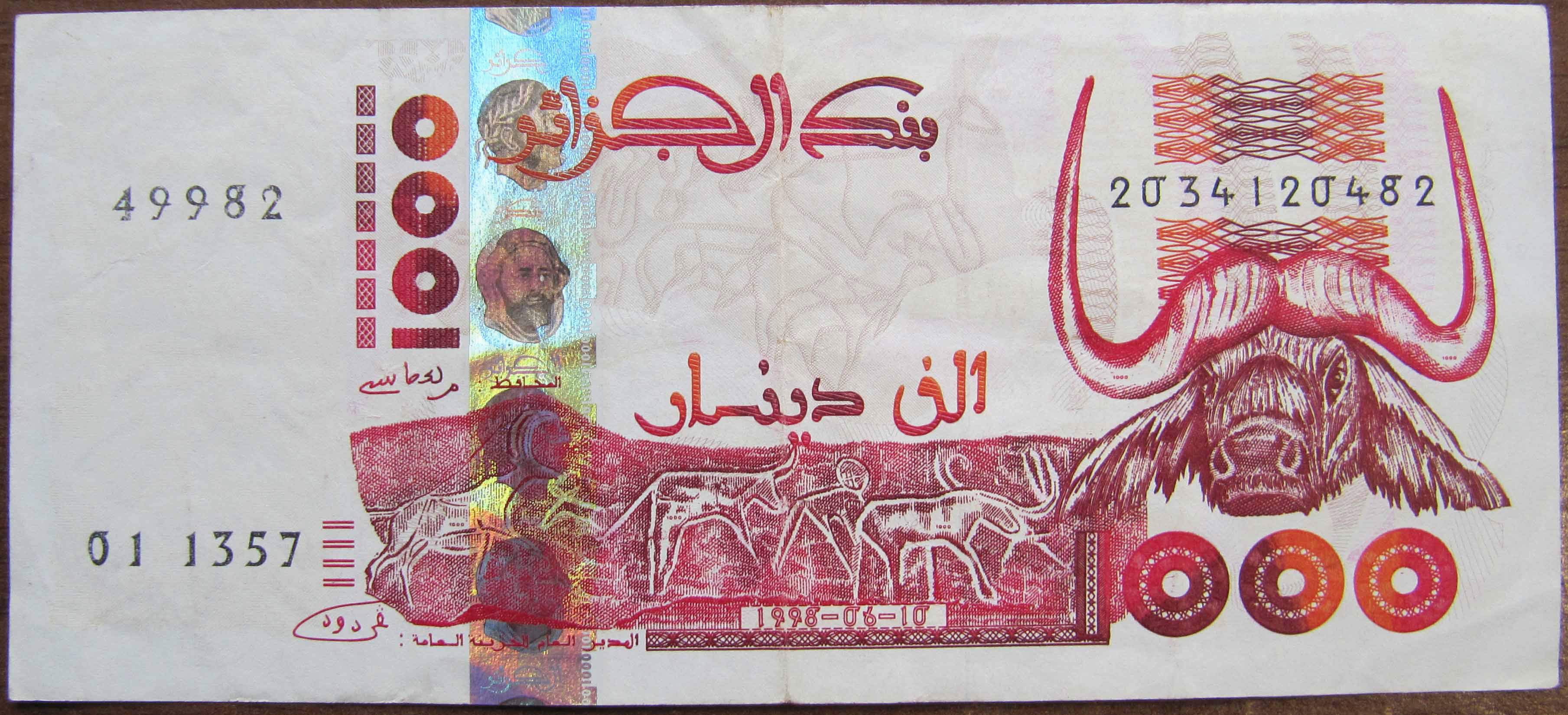 Опис лицьової сторони:в центре банкноты наскальные рисунки с плато Тассилин-Адджер. Тассилин-Адджер (в переводе «Плато рек») — плато в юго-восточной части Алжира, в пустыне Сахара. На плато в разные годы были найдены петроглифы, датируемые от 7 тысячелетия до н. э. до VII века н. э. Объект ЮНЕСКО с 1982. Это один из крупнейших памятников наскального искусства Сахары. Справа голова буйвола. Номинал цифрами - слева вверху (вертикально) и справа внизу. Серия - слева на белом поле и номер - справа вверху.