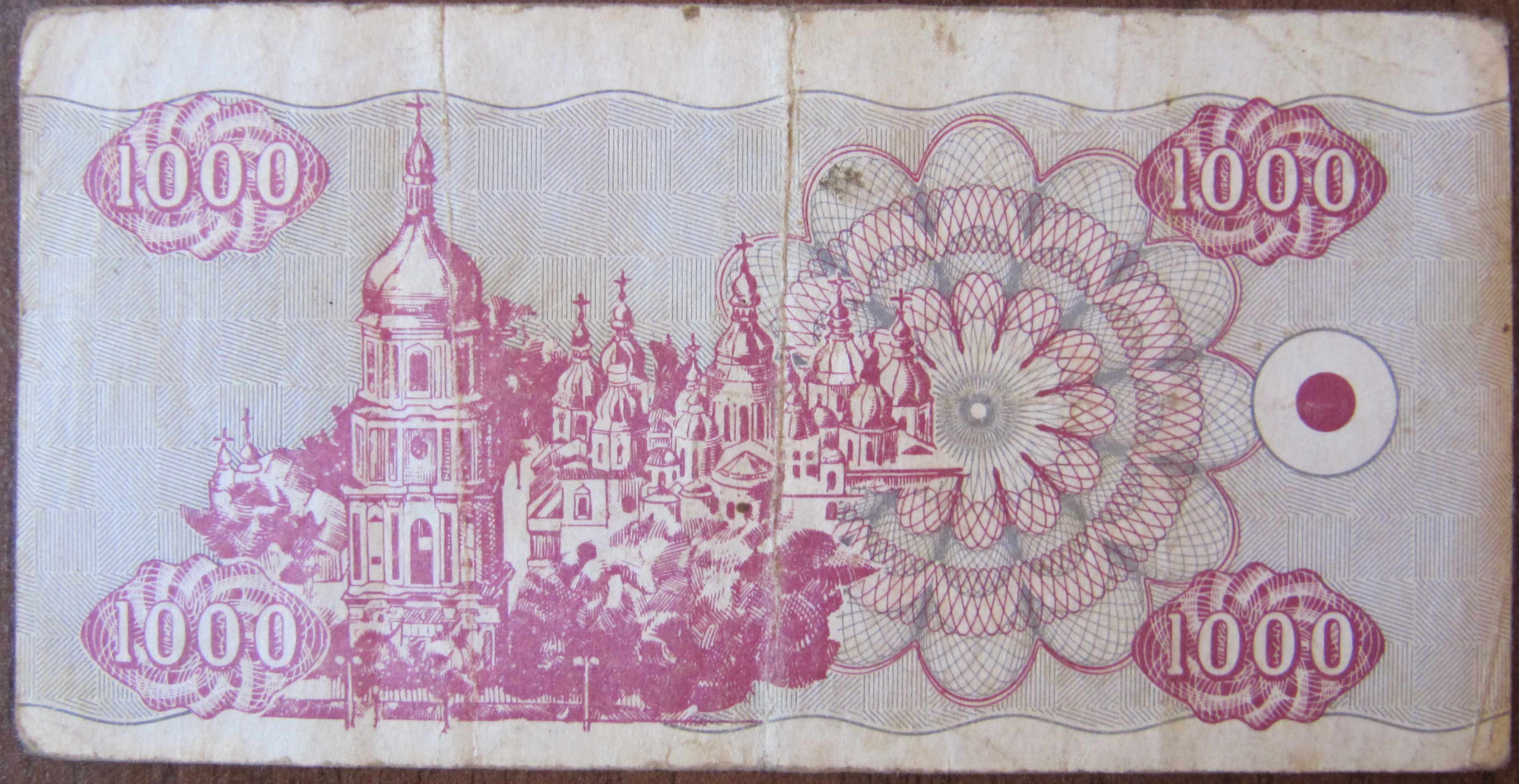 в центре на фоне орнамента изображен Собор Святой Софии Киевской. Номинал цифрами расположен в четырех углах банкноты.