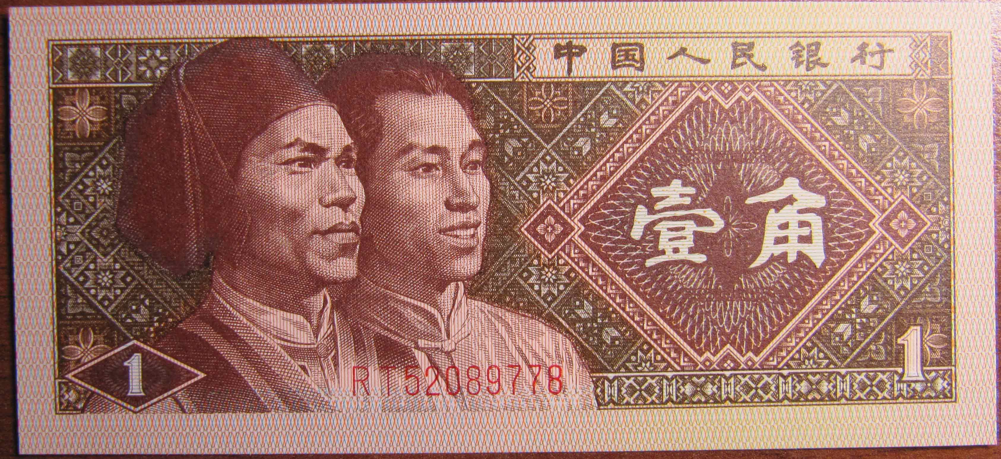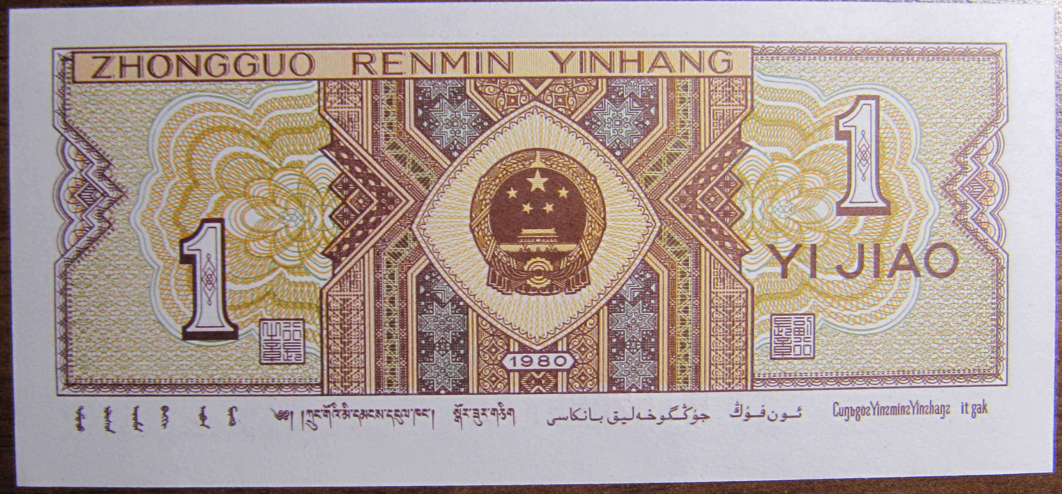 Опис зворотньої сторони:в левой верхней части банкноты надпись: ZHONGGUO RENMIN YINHANG (НАРОДНЫЙ БАНК КИТАЯ). В центре банкноты – герб страны (изображение главных ворот бывшего императорского дворца Тай Ху-Тиен, находящихся при входе в запретный город (Гугун) в центре Пекина, вверху пять звезд, внизу шестерня; всё изображение заключено в венок). Слева от герба – номинал цифрой, справа – цифрой и прописью YI JIAO.
