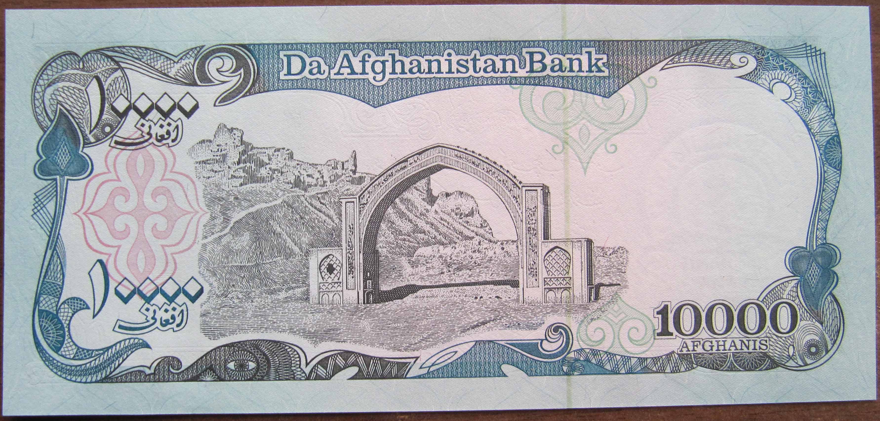 в центре изображена 25-и метровая арка проход возле аэропорта Бост (Лашкар Гах). На заднем плане холмы и древние развалины с подземными ходами. В верхней части узорчатой рамки надпись: Da Afghanistan Bank. Номинал арабскими цифрами размещен слева в верхнем и нижнем углах рамки, прописью "10000 AFGHANIS" – в правом нижнем углу.