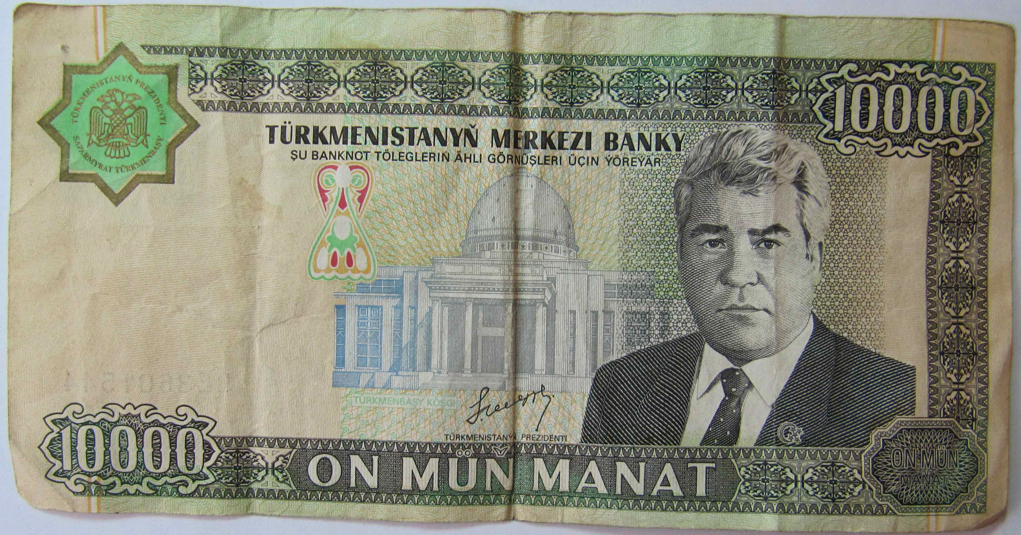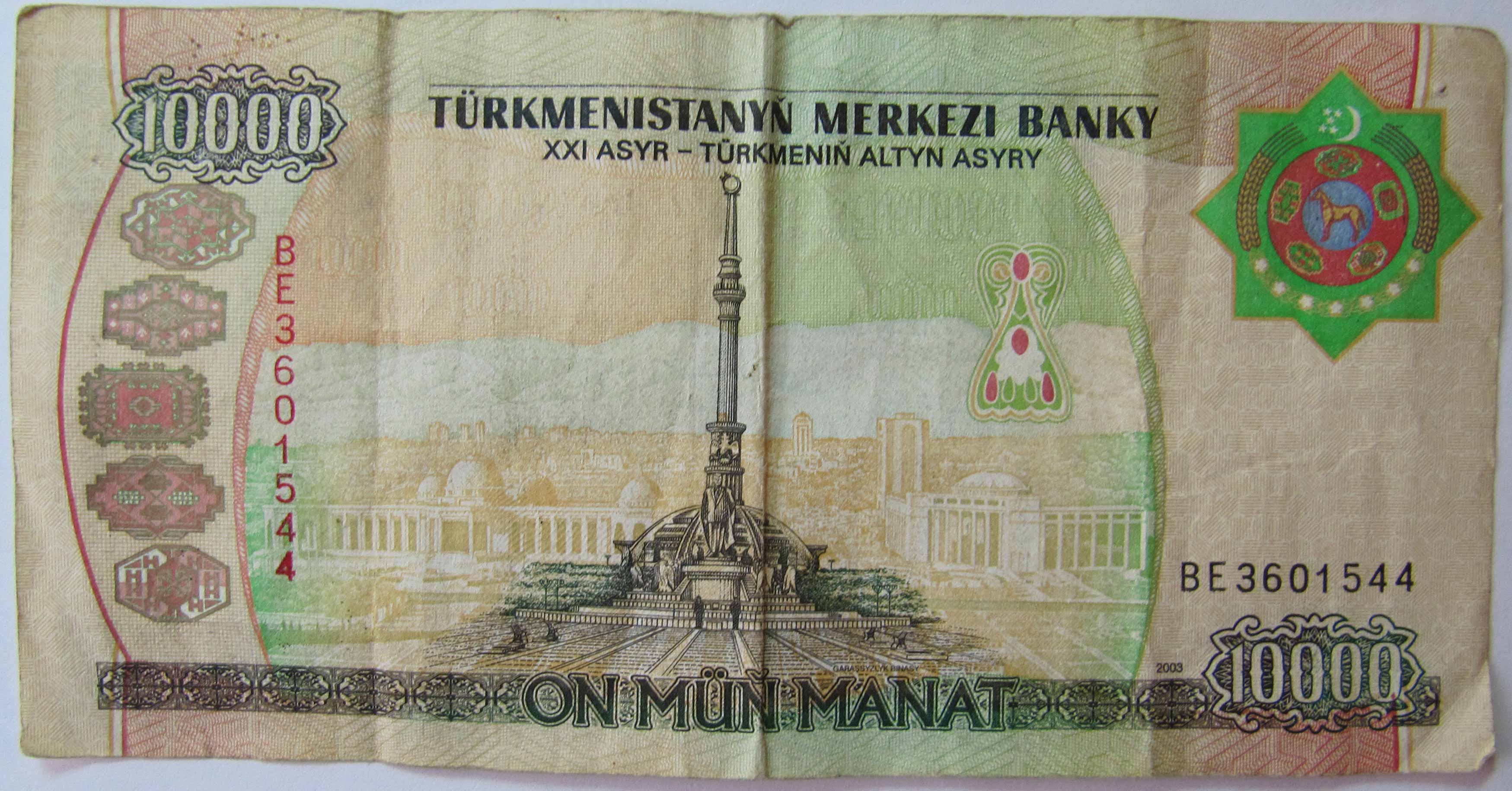 Опис лицьової сторони:портрет президента Туркменистана Сапармурата Ниязова справа, здание Президентского дворца в центре. Сверху надпись: TURKMENISTANYŇ MERKEZI BANKY, слева внизу и справа вверху - номинал цифрами, по середине внизу - номинал прописью: ON MUN MANAT.