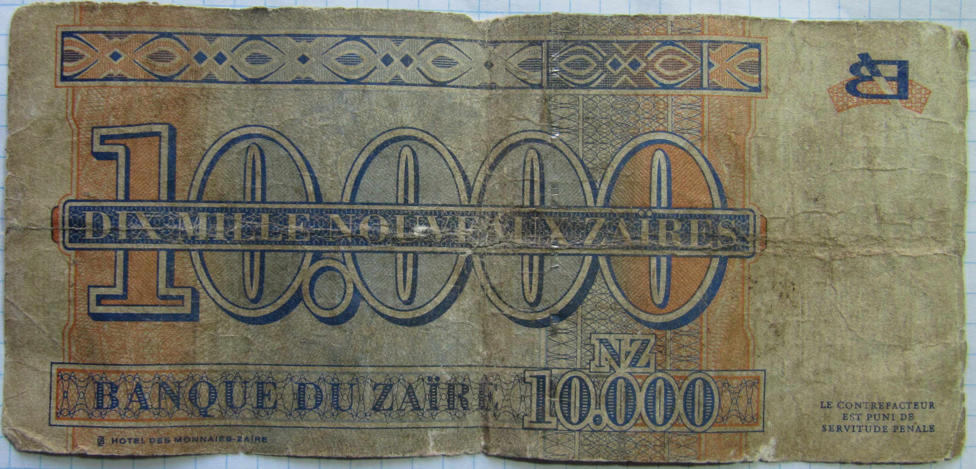 Опис зворотньої сторони:в центре между полосами национального орнамента размещен номинал цифрами и прописью: DIX MILLE NOUVEAUX ZAЇRES. Слева внизу надпись: BANQUE DU ZAЇRE и еще раз номинал цифрами. Справа вверху - эмблема Банка Заира.