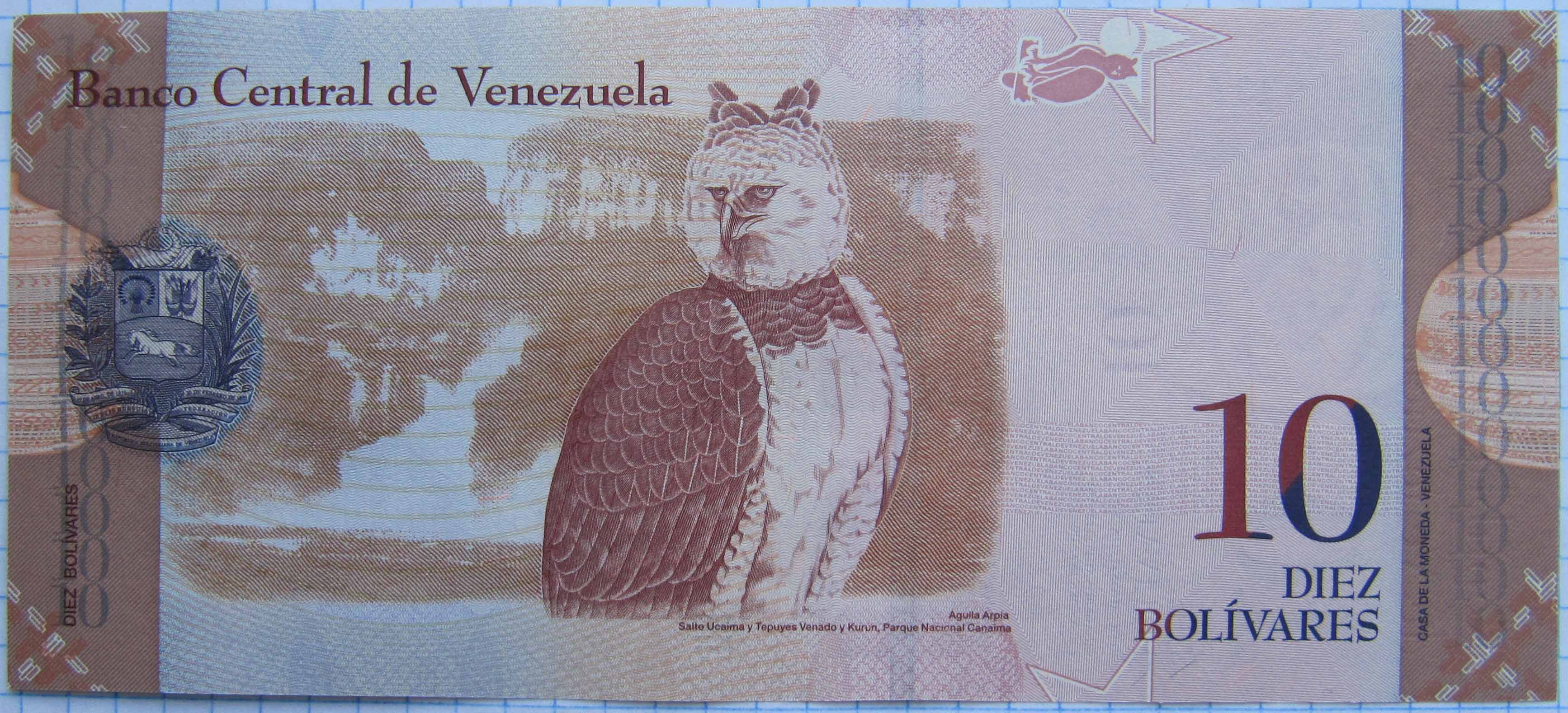 на фоне стилизованного пейзажа изображена южноамериканская гарпия (Harpia harpyja), крупная хищная птица из семейства ястребиных, в левой части – герб Венесуэлы. В левой верхней части банкноты надпись: Banco Central de Venezuela, в правом нижнем углу – номинал: DIEZ BOLIVARES. В левой и правой частях банкноты – вертикальная полоса из повторяющегося номинала цифрами.