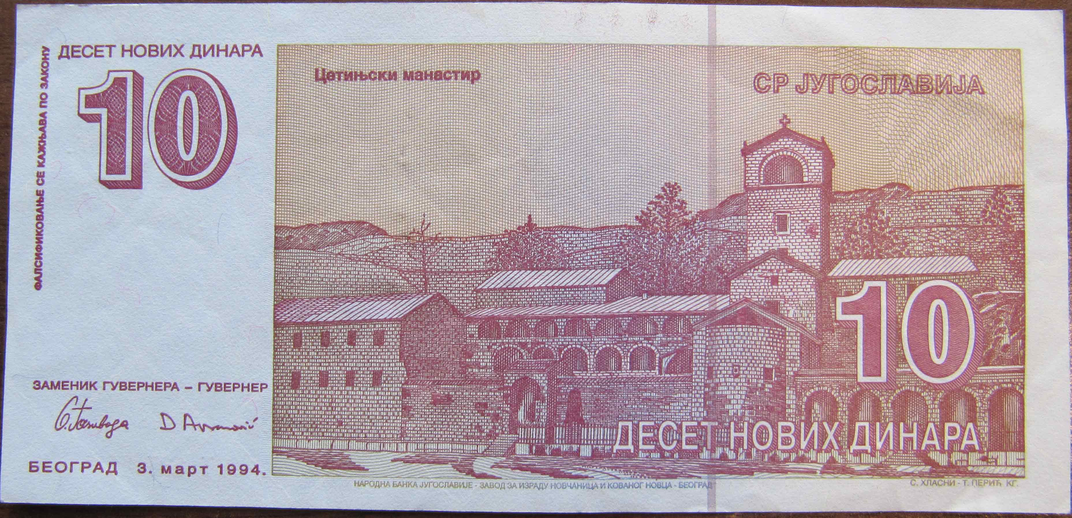 Опис зворотньої сторони:в центре изображение Цетинского монастыря. Цетинский монастырь — православный монастырь Рождества Пресвятой Богородицы в исторической столице Черногории, городе Цетине. Был построен в 1484 году Иваном Черноевичем. Слева вверху и справа внизу номинал прописью и цифрами. Слева внизу казначейские подписи и дата эмиссии.