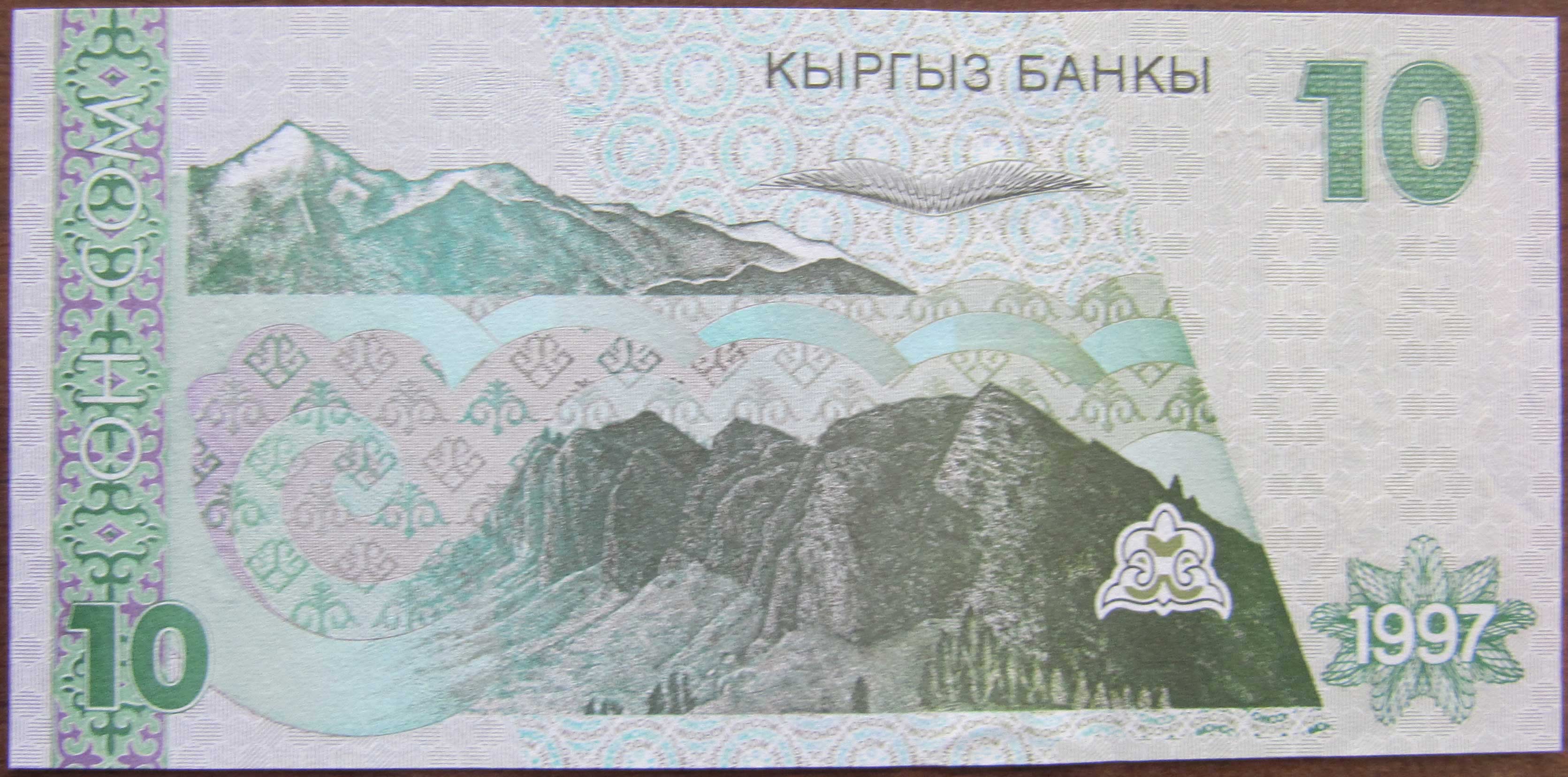 Опис зворотньої сторони:в центре банкноты изображено Джеты-Огузское ущелье. Джеты́-Огу́з или скалы Семи Быков — живописное горное ущелье в Киргизии в 28 км на запад от города Каракол (бывший Пржевальск) по южному берегу Иссык-Куля. Слева номинал цифрой и прописью (вертикально), справа номинал цифрой и дата эмиссии. Вверху надпись: КЫРГЫЗ БАНКЫ.