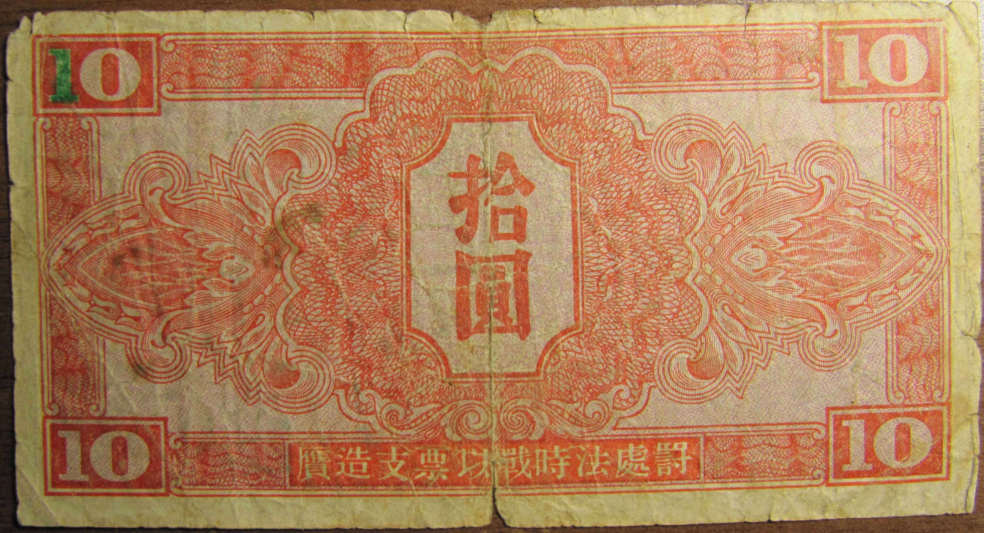 Опис лицьової сторони:в центре, в узорной виньетке - номинал иероглифами. Вверху (иероглифами) - название эмитент-банка. В четырех углах банкноты - номинал цифрами. Серийный номер - в левой и правой частях банкноты.