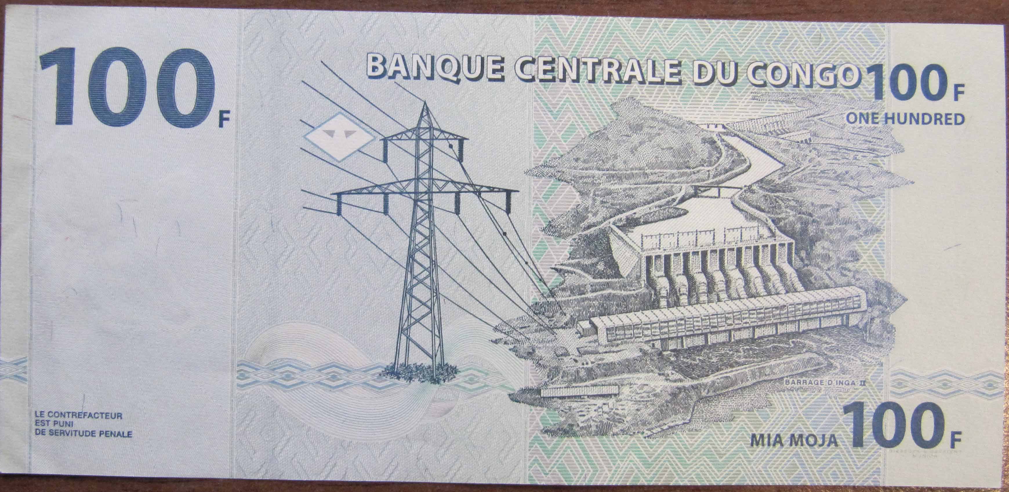 Опис зворотньої сторони:в правой части банкноты, на фоне национального орнамента изображена плотина Инга II на р. Конго, под изображением – пояснительная надпись. В верхней части банкноты надпись в одну строку: BANQUE CENTRALE DU CONGO. По углам банкноты расположен номинал – в левом верхнем: 100 F, в правом верхнем: 100 F / ONE HUNDRED и в правом нижнем: MIA MOJA 100 F.