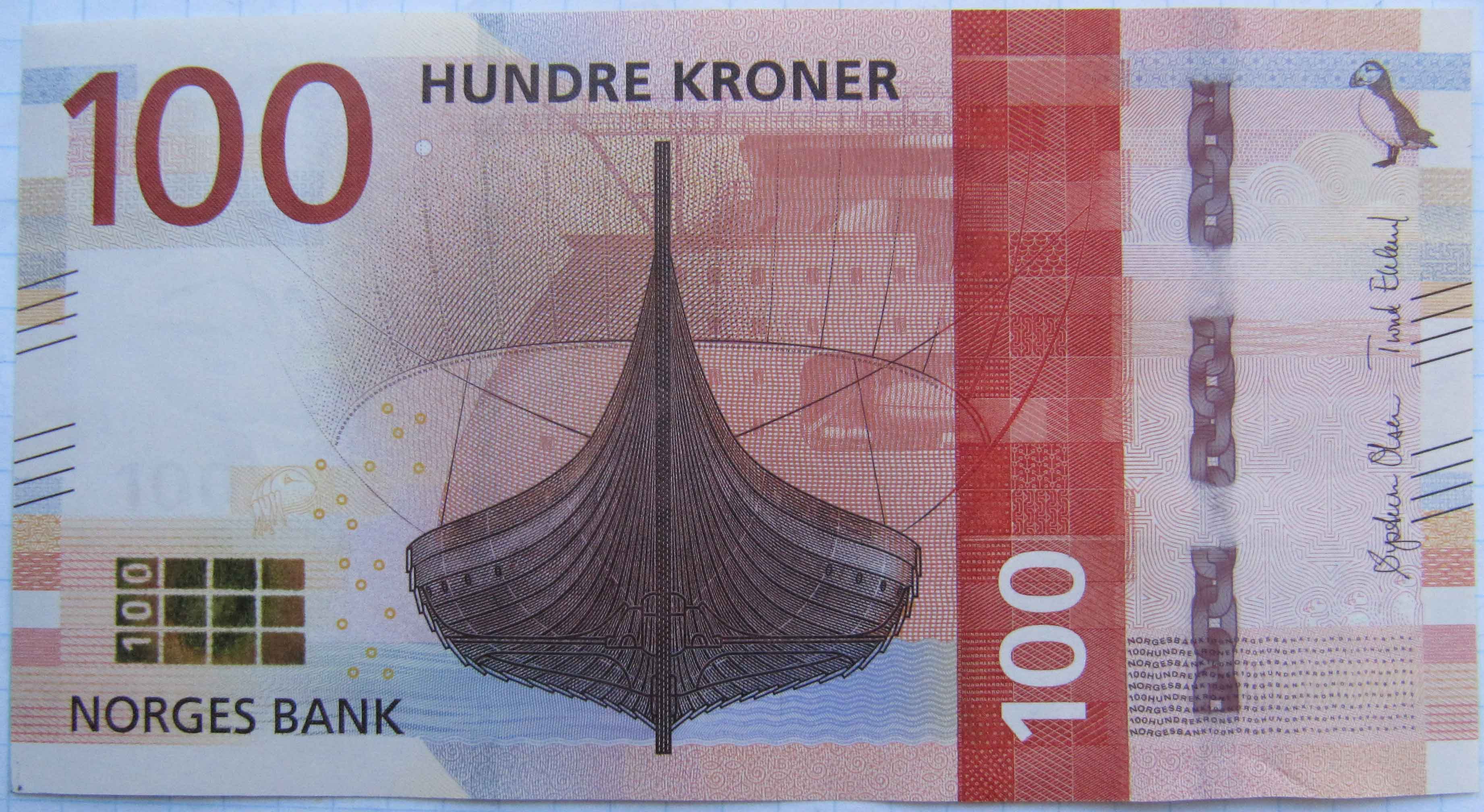 Опис зворотньої сторони:в центре изображение грузового судна в пикселях, глобус и часть созвездия Ориона. Номинал указан в левом нижнем (вертикально) и правом верхнем углах цифрами. В нижней части банкноты номинал прописью и надпись на норвежском языке: «NORGES BANK». Серийный номер размещен в левом верхнем углу и по центру вверху.