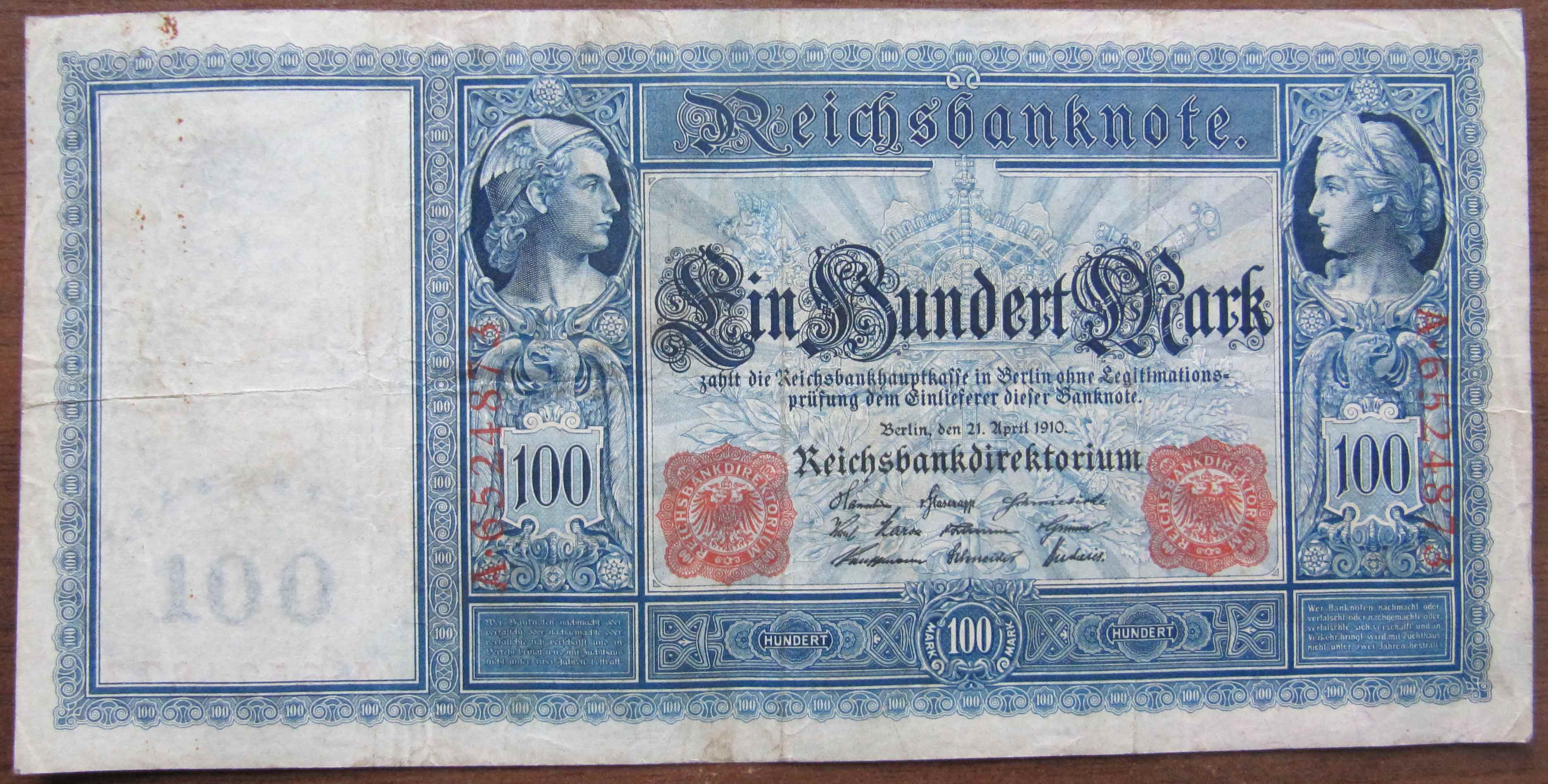 Опис лицьової сторони:орнаментированное поле банкноты разделено на два прямоугольника. В левом – водяной знак в виде головы кайзера Вильгельма I, внизу номинал цифрой в овале из звезд. В правом прямоугольнике слева голова Меркурия в овальной виньетке, справа – голова Цереры, под виньетками орел, номинал числом 100, вертикально – красный серийный номер, внизу – информация казначейства. В центре прямоугольника – корона над перекрещенными скипетром и мечом, внизу – дубовые листья. Поверх надписи готическим шрифтом в шесть строк: