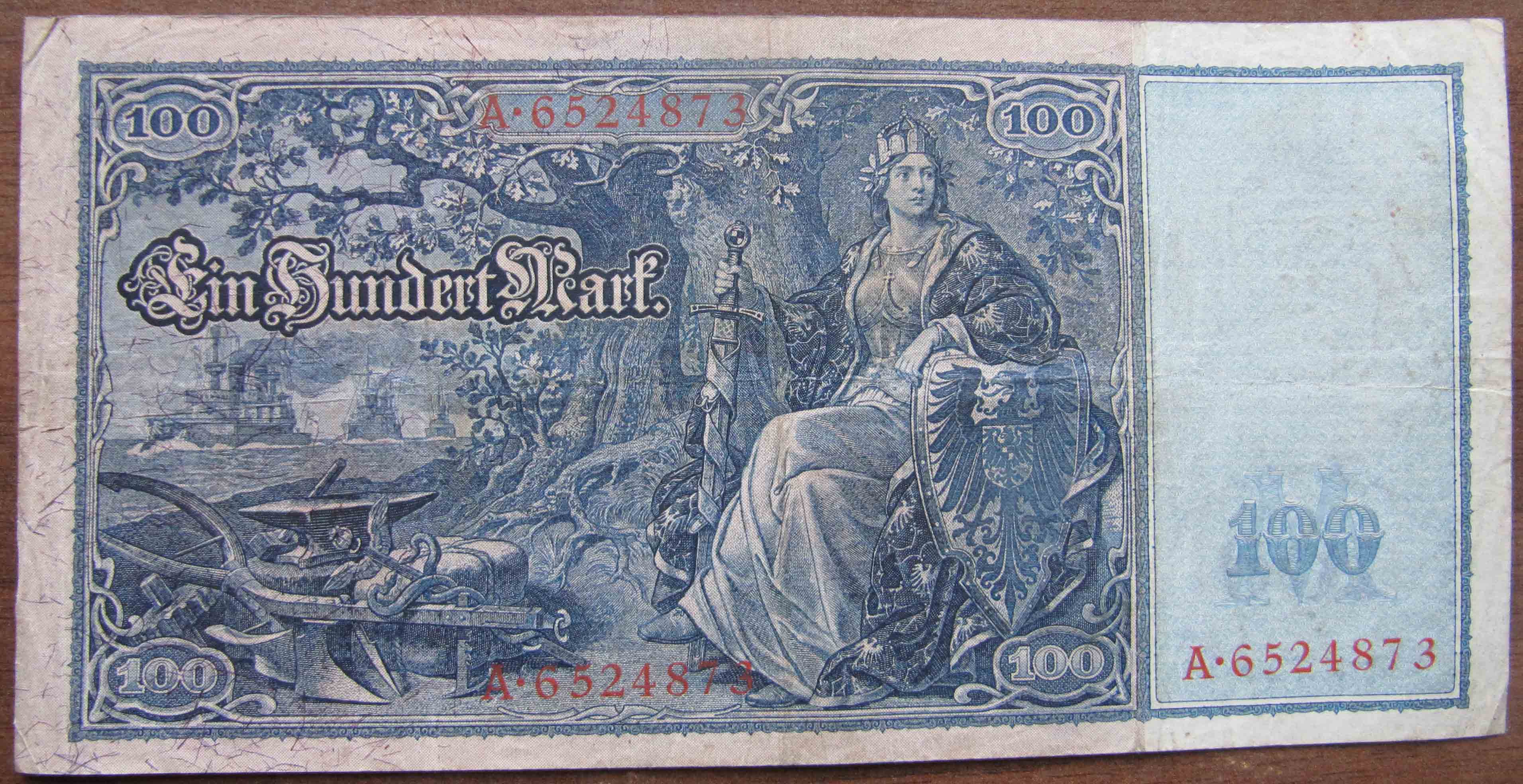 Опис зворотньої сторони:орнаментированное поле банкноты разделено на два прямоугольника. На правом – номинал цифрой на литере М. Внизу – красный серийный номер. По четырем углам левого прямоугольника номинал цифрой в виньетке. Справа – сидящая Германия (прототипом для изображения была немецкая актриса Анна фон Странц) в короне, панцире и императорской мантии. Правой рукой она опирается на меч, левой – на щит с гербом Германской империи. Слева композиция, символизирующая военное и экономические развитие империи: наковальня, плуг, молот, шестеренка и кадуцей Меркурия, в море – три военных крейсера. Слева от фигуры Германии номинал прописью: EIN HUNDERT MARK, вверху и внизу – красный серийный номер. В левой части расположены защитные волокна красного и синего цветов.
