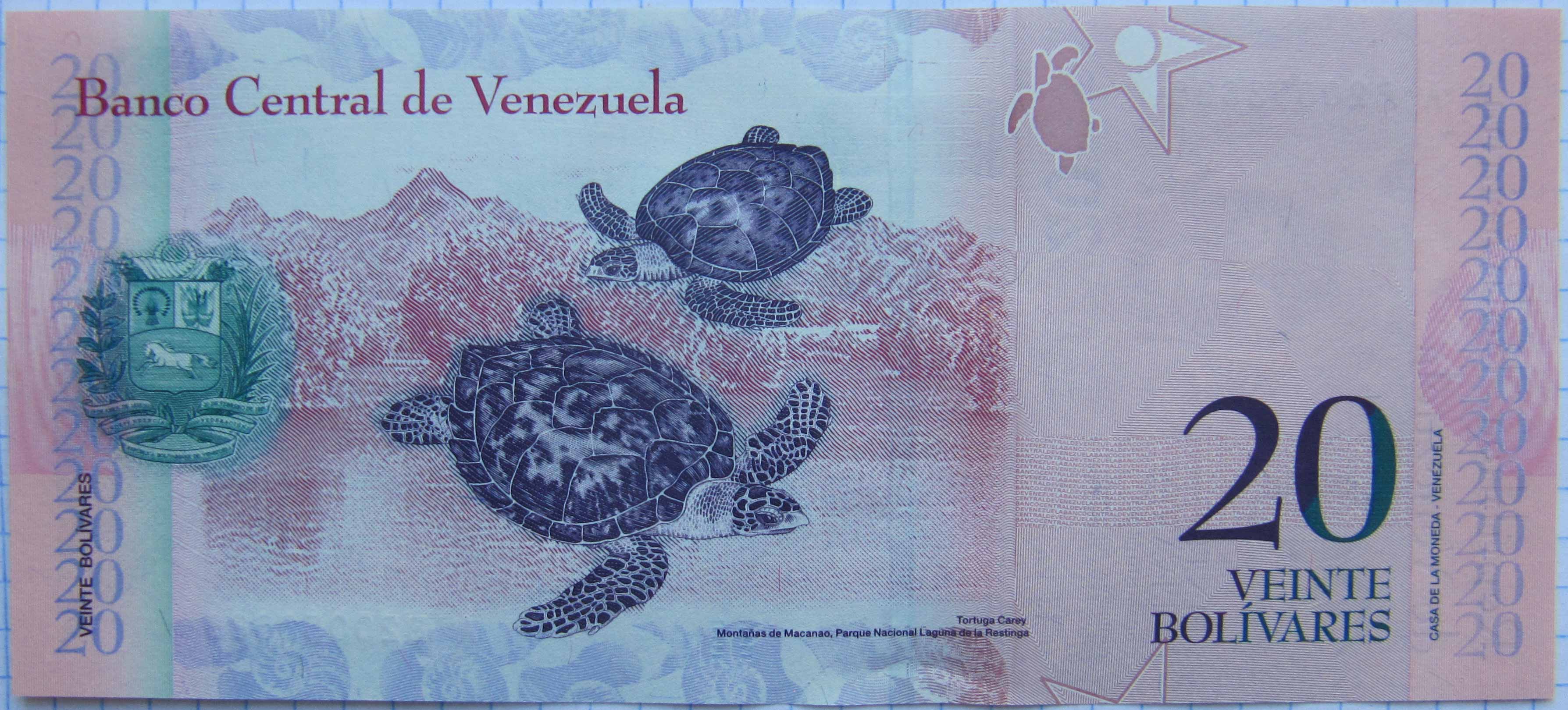 Опис зворотньої сторони:на фоне стилизованных речных мотивов изображены две морские черепахи-биссы (Eretmochelys imbricata), в левой части – герб Венесуэлы. В левой верхней части банкноты надпись: Banco Central de Venezuela, в правом нижнем углу – номинал: VEINTE BOLIVARES. В левой и правой частях банкноты – вертикальная полоса из повторяющегося номинала цифрами.