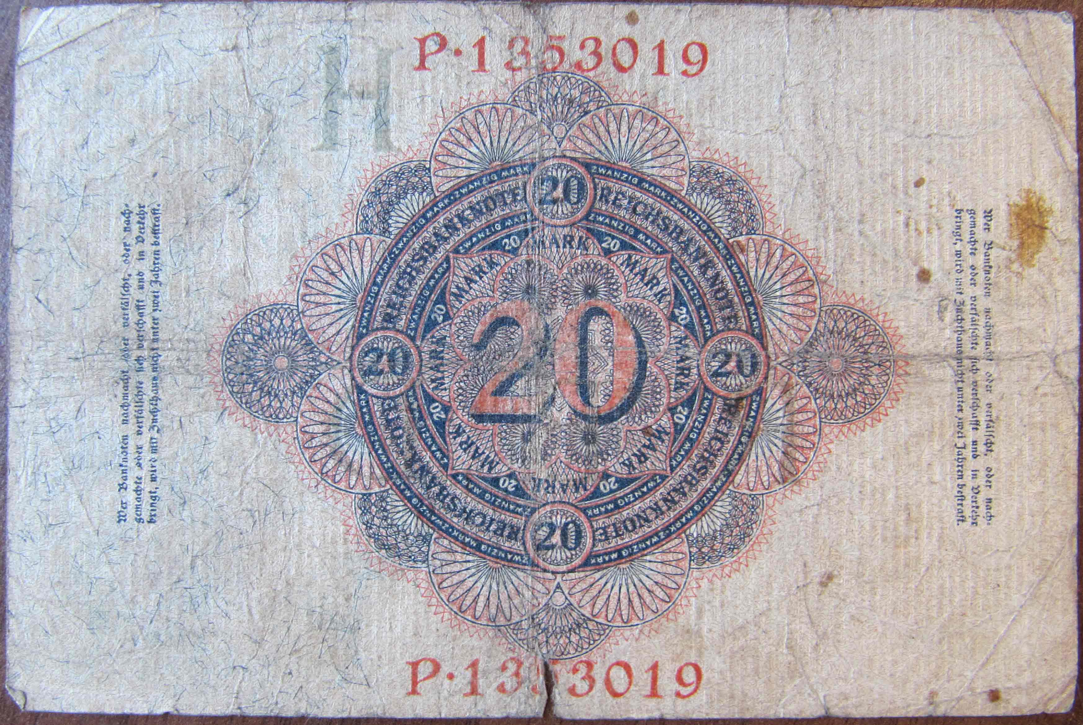 Ниже – казначейские подписи на фоне двух номиналов цифрами. Слева и справа от надписей две узорные виньетки, разделенные цифрами 20. В левой верхней части виньетки – стилизованная заглавная литера Z слова ZWANZIG, в правой – герб Германской империи. По левому и правому краям банкноты вертикально помещен серийный номер, цвет красный, серия обозначена буквой.