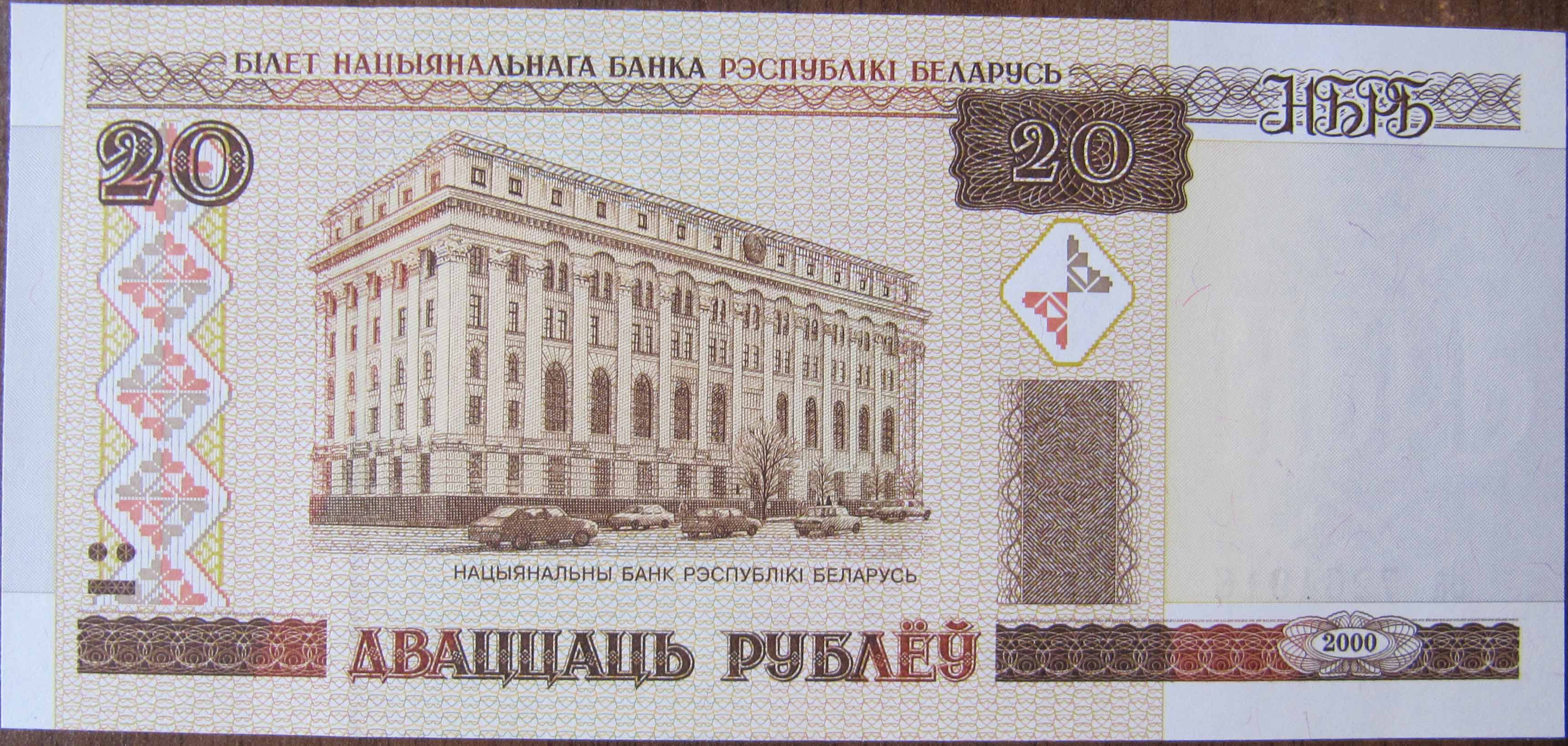 Опис лицьової сторони:изображено здание Национального банка Беларуси, под изображением помещена подпись «НАЦЫЯНАЛЬНЫ БАНК РЭСПУБЛІКІ БЕЛАРУСЬ». Слева и справа от изображения помещены графические знаки защиты. В верхней части поля банкноты проходит орнаментальная полоса, в которой помещена надпись «БІЛЕТ НАЦЫЯНАЛЬНАГА БАНКА РЭСПУБЛІКІ БЕЛАРУСЬ», а снизу прилегает защитный микротекст из повторяющейся аббревиатуры «НБРБ», в правой верхней части банкноты на фоне орнаментальной полосы помещена большая аббревиатура «НБРБ». Номинал обозначен цифрами в левой части банкноты, внутри виньетки справа сверху относительно центрального изображения, и словами «ДВАЦЦАЦЬ РУБЛЁЎ» под изображением банка. В нижней части проходит узорная кайма, к которой сверху прилегает микротекст из повторяющихся чисел «20», в правом нижнем углу банкноты внутри виньетки помещено обозначение года «2000».