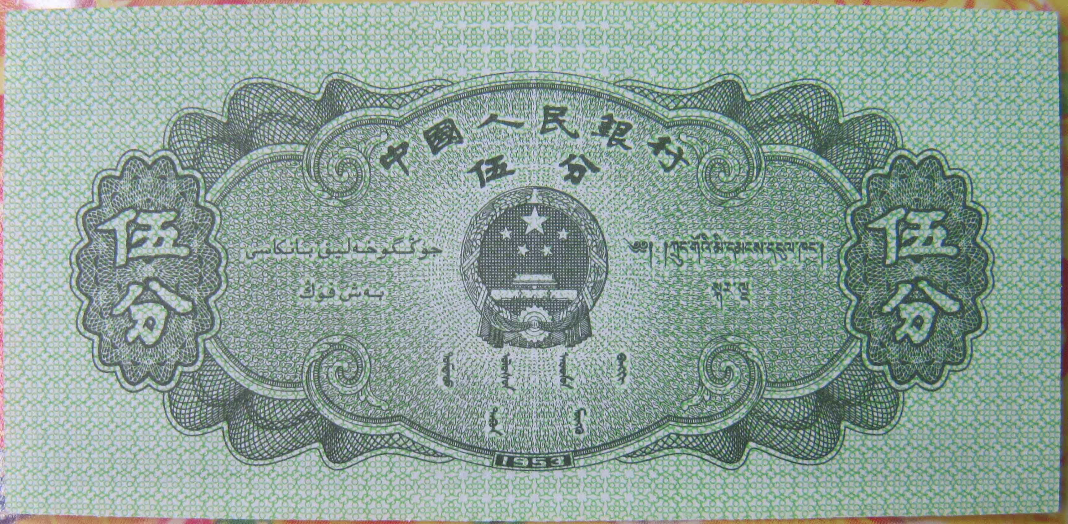 Опис зворотньої сторони:герб КНР и номинал банкноты с двух сторон. Надписи на четырёх языках - (чжуанском, монгольском, уйгурском, тибетском), являющимися официальными в автономных районах Китая.