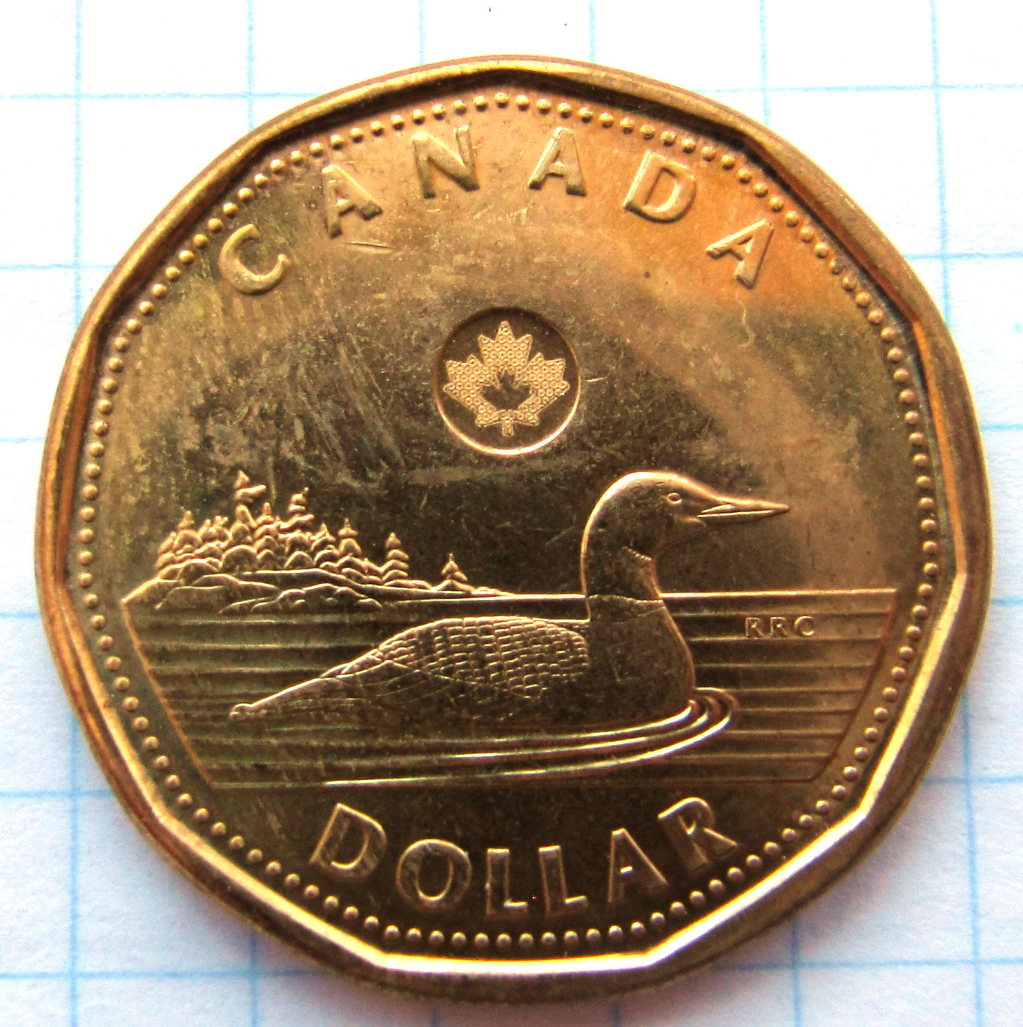 Аверс:полярная гагара в озере на фоне островов с елями; внизу номинал полукругом – DOLLAR. В верхней части монеты надпись полукругом – CANADA и канадский кленовый лист в небольшом круге.