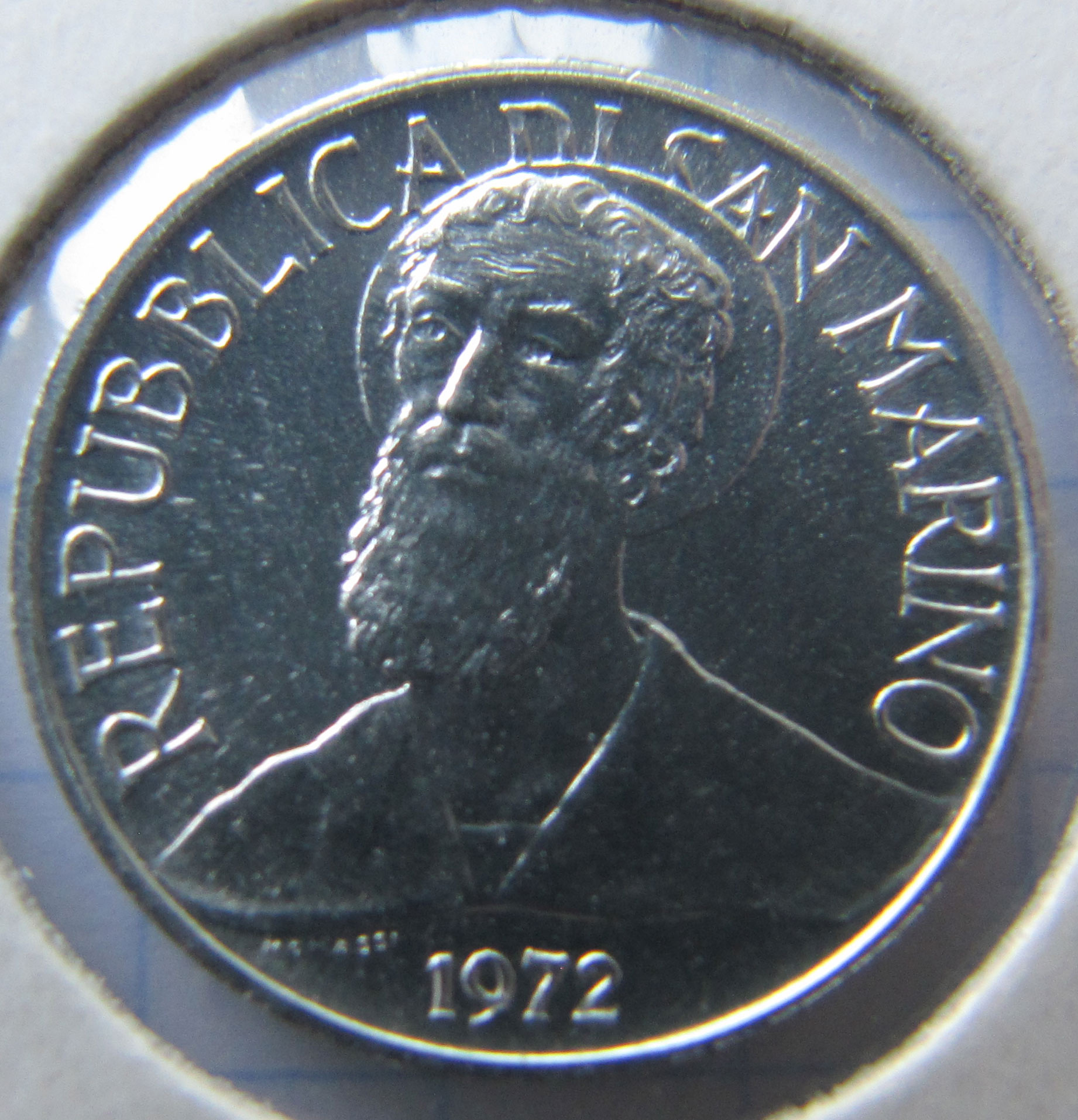 лик святого Марина, ниже - год чеканки монеты. По кругу надпись: REPUBBLICA DI SAN MARINO.