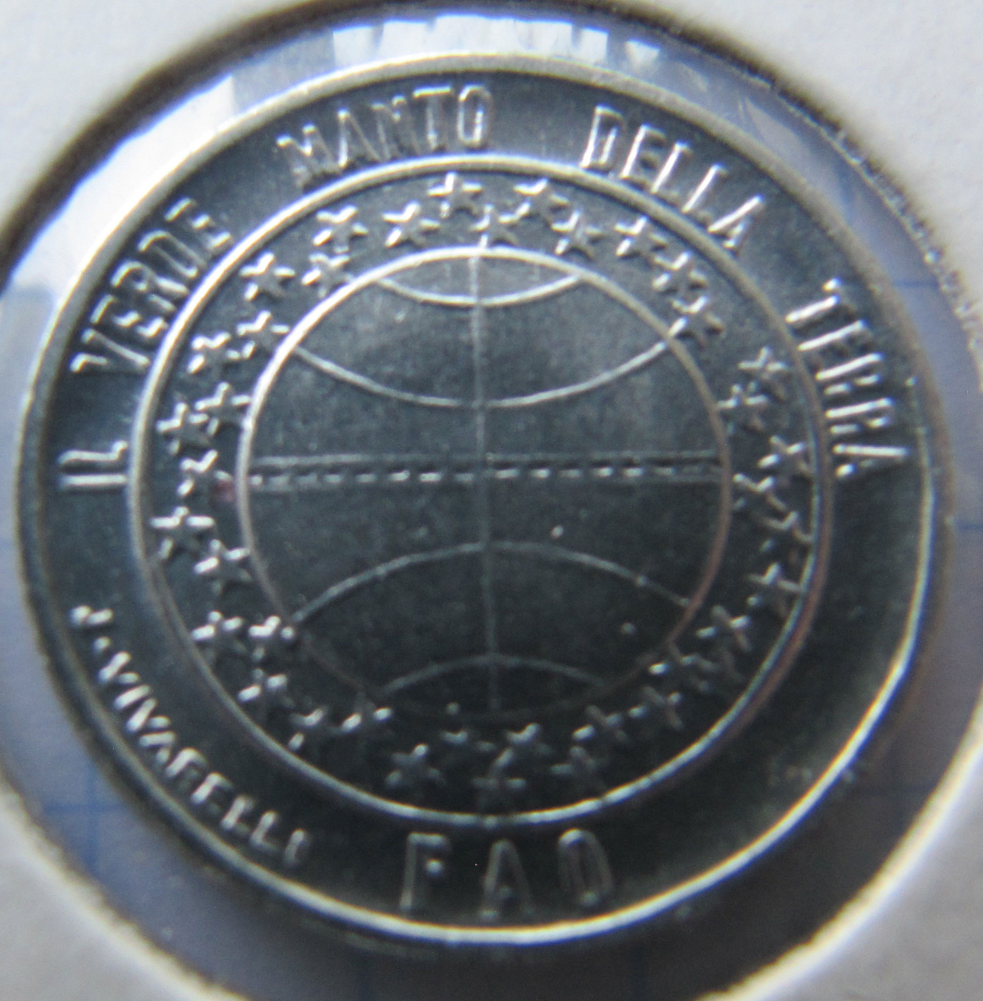 Реверс:земной шар вокруг которого множество звезд, сверху по кругу надпись: IL VERDE MANTO DELLA TERRA (зеленый покров Земли), снизу - FAO.