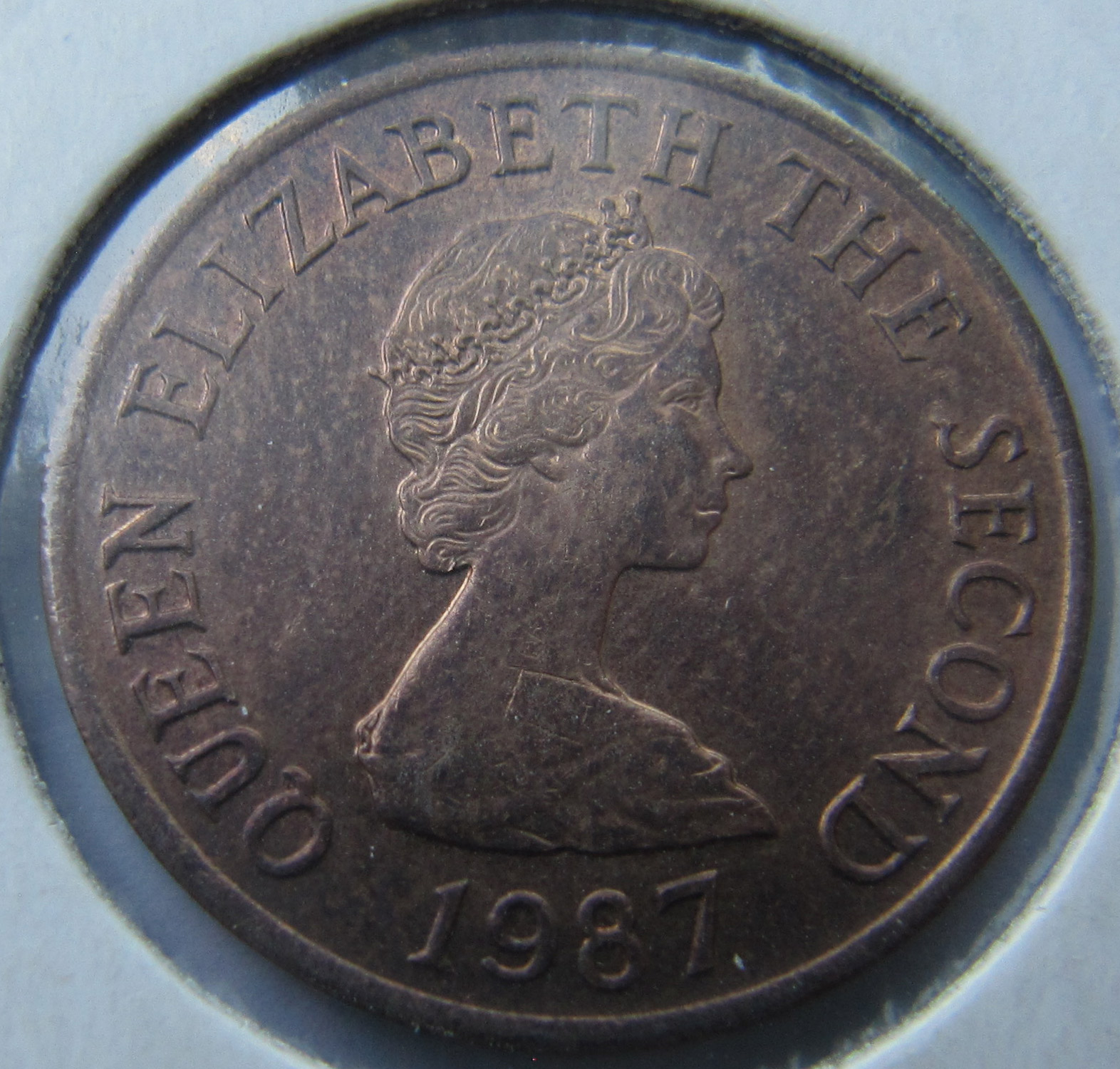 Аверс:сторожевая башня Ле Хок в Сент-Клементе (1781 г), по кругу надпись: BAILIWICK OF JERSEY, снизу номинал ONE PENNY.