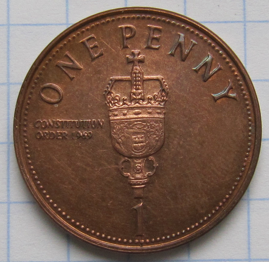 Аверс:скіпетр - символ британської монархії та номінал цифрою, вгорі по колу номінал прописом ONE PENNY.