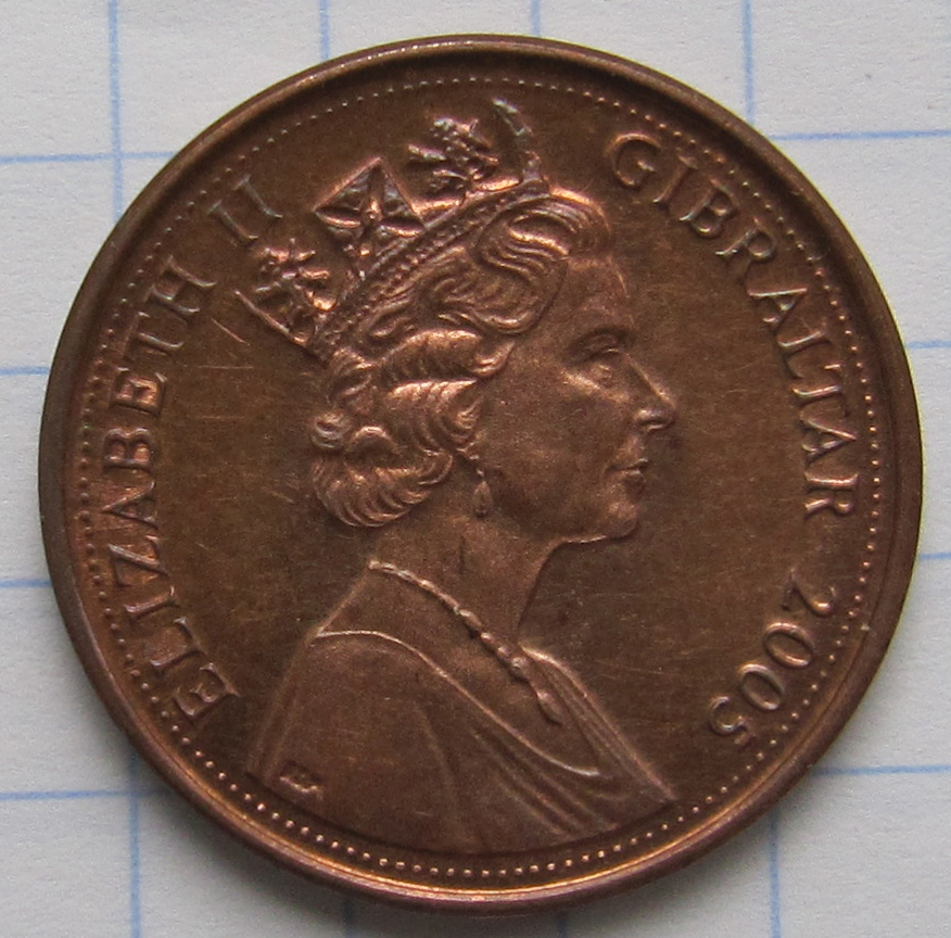 Реверс:портрет королеви Єлизавети II вправо, по колу напис: ELIZABETH II GIBRALTAR і рік карбування монети.