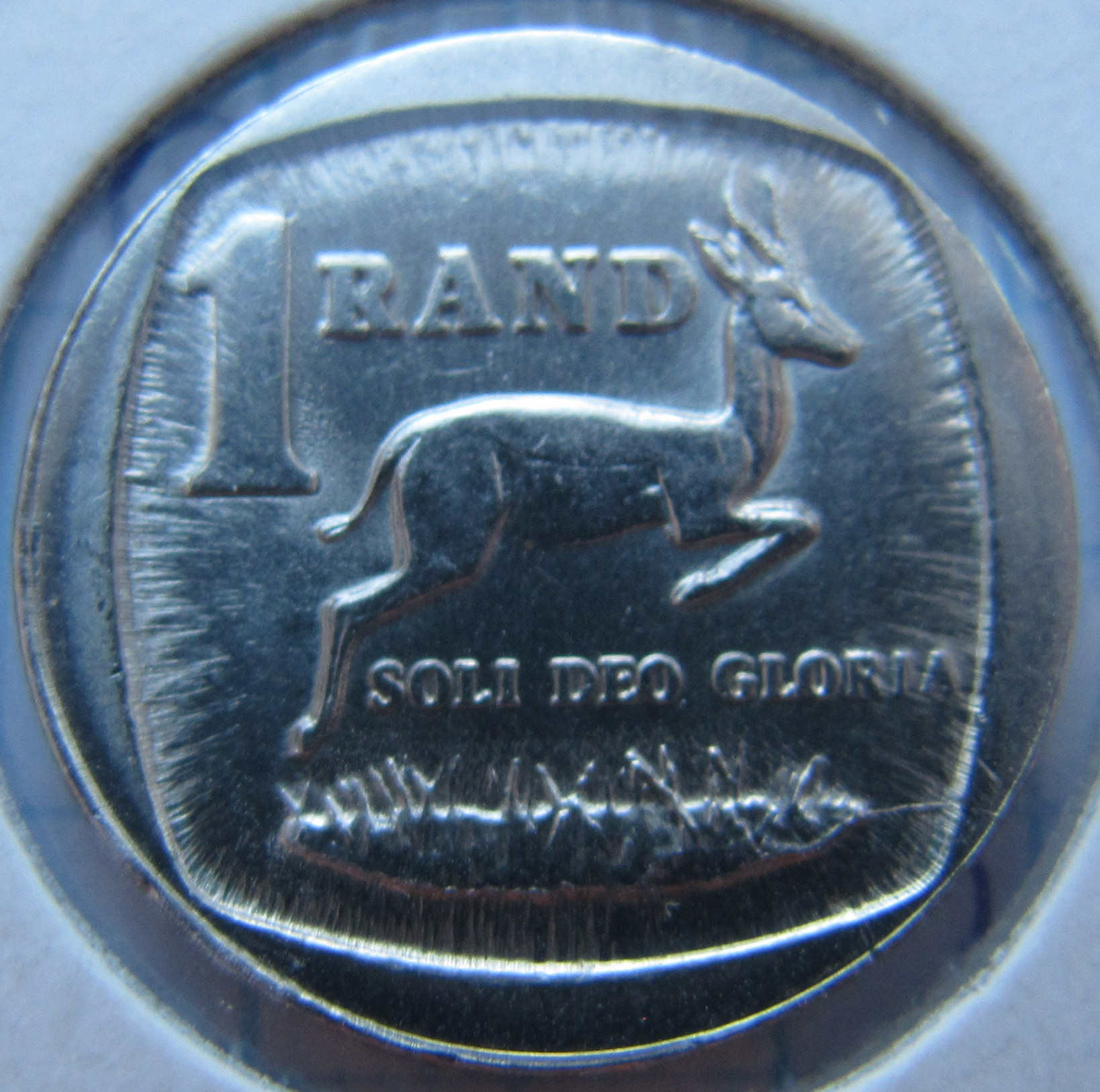 Аверс:номинал 1 RAND и прыгающая африканская антилопа или спрингбок. Под животным - надпись на латыни ''SOLI DEO GLORIA'' - ''Лишь Господу одному Cлава''.