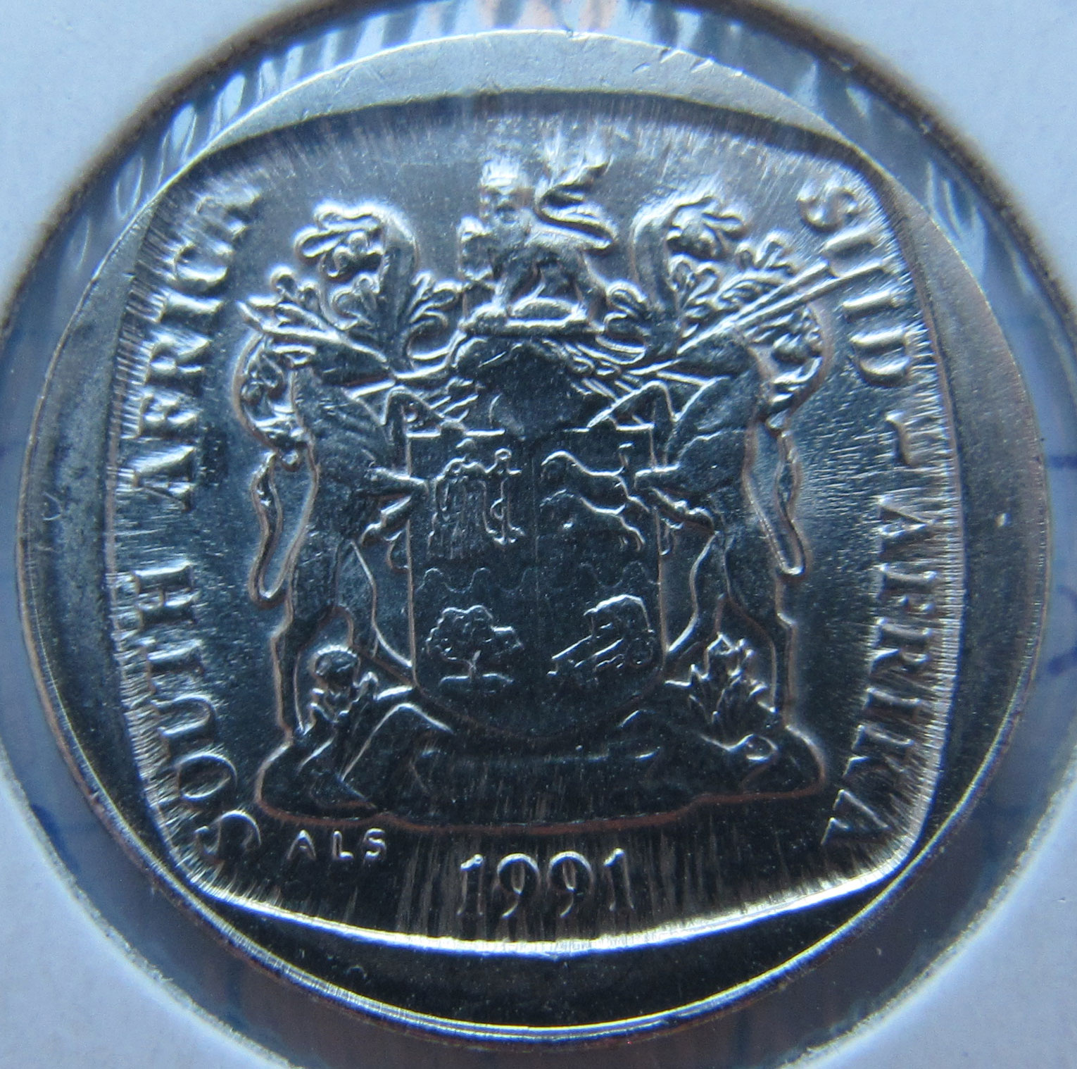 Реверс:герб ЮАР образца 1932-2000гг. Название страны на английском языке SOUTH AFRICA и языке африкаанс SUID-AFRIKA. Снизу - год чеканки монеты.