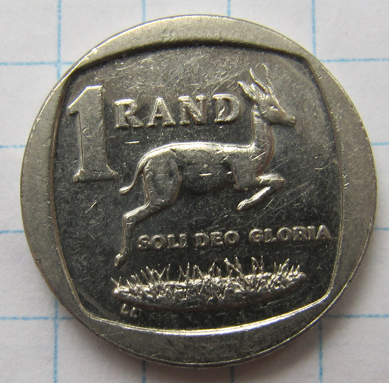 Аверс:номинал 1 RAND и прыгающая африканская антилопа или спрингбок. Под животным - надпись на латыни ''SOLI DEO GLORIA'' - ''Лишь Господу одному Cлава''.