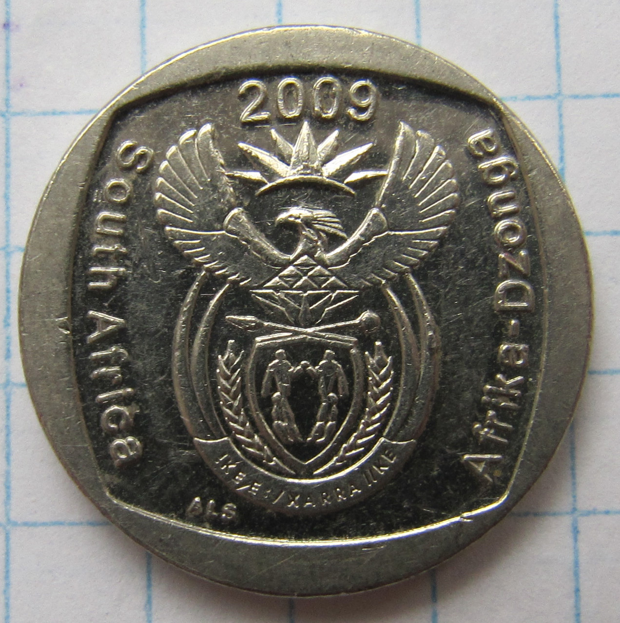 Реверс:новый герб ЮАР. Название страны на английском языке South Afrika и языке тсонга Afrika-Dzonga. Сверху год чеканки монеты.