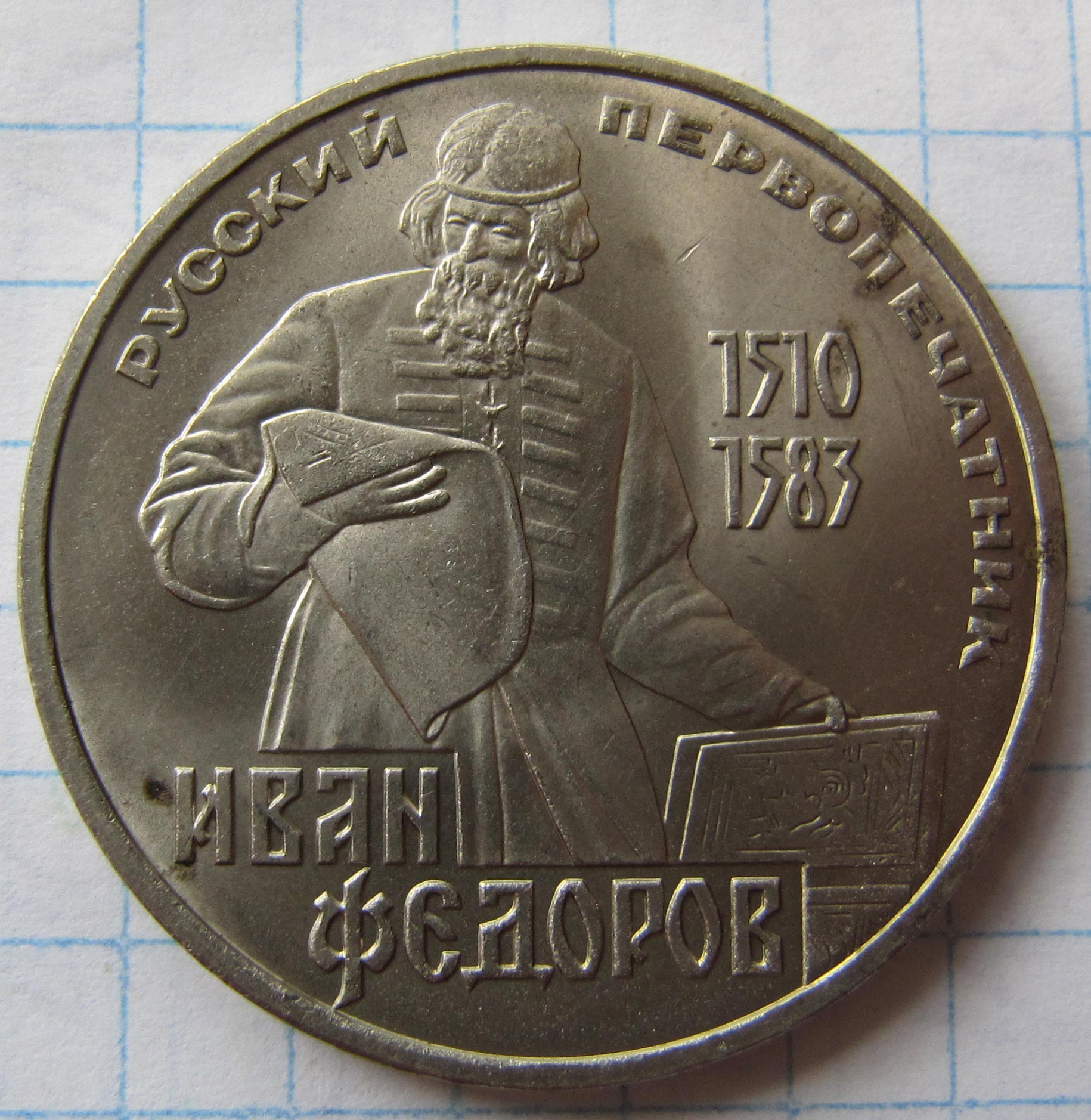 в центре изображение фрагмента памятника Ивану Федорову в Москве, справа от него в две строки даты «1510» и «1583». В нижней части надпись в две строки: «ИВАН ФЕДОРОВ», в верхней части полукругом «РУССКИЙ ПЕРВОПЕЧАТНИК».