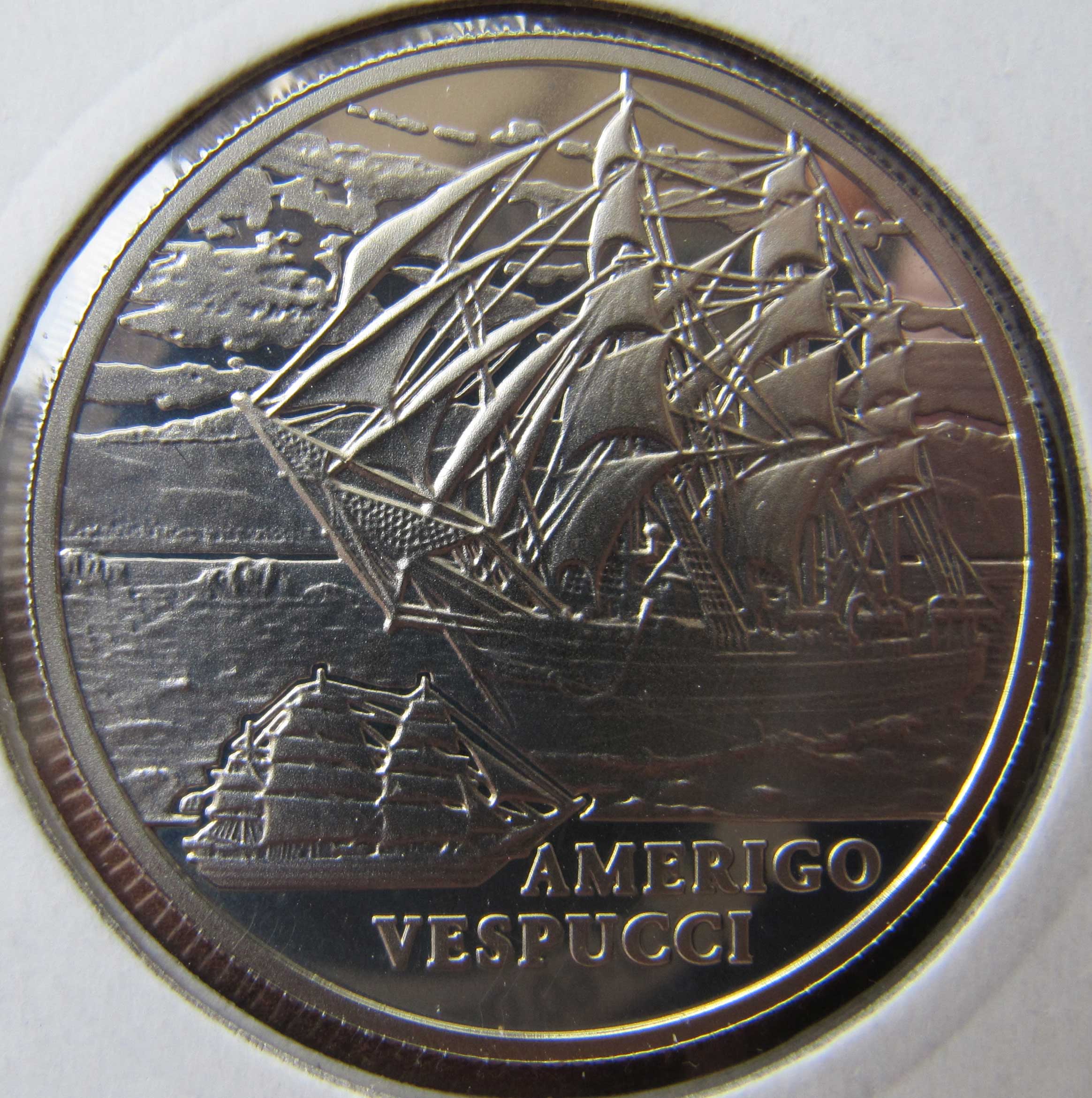 Реверс:изображение одного из крупнейших в мире парусных судов "Америго Веспуччи (Amerigo Vespucci)" на фоне морского пейзажа, слева – уменьшенное изображение данного корабля (вид сбоку), рядом надпись "АMERIGO VESPUCCI" в оригинальном начертании.