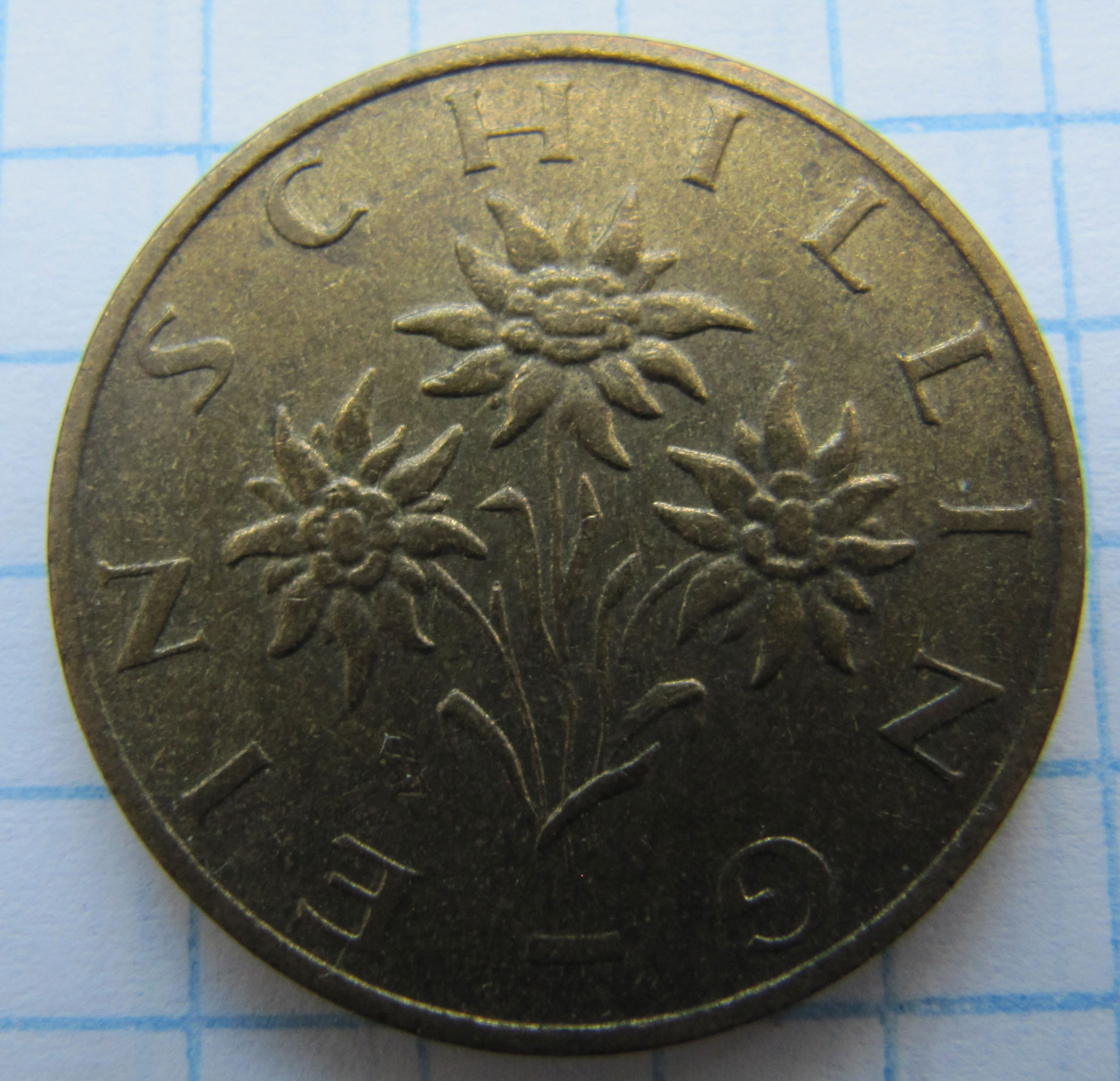цветы эдельвейса произрастающие в австрийских Альпах, по кругу номинал прописью EIN SCHILLING.