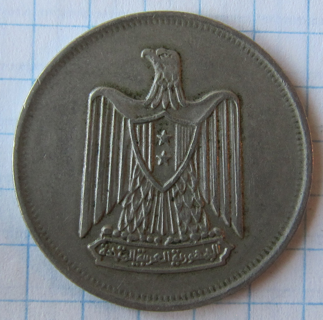 Реверс:герб страны: орел Саладина с прямыми крыльями, на груди щит с двумя вертикально расположенными звездами.