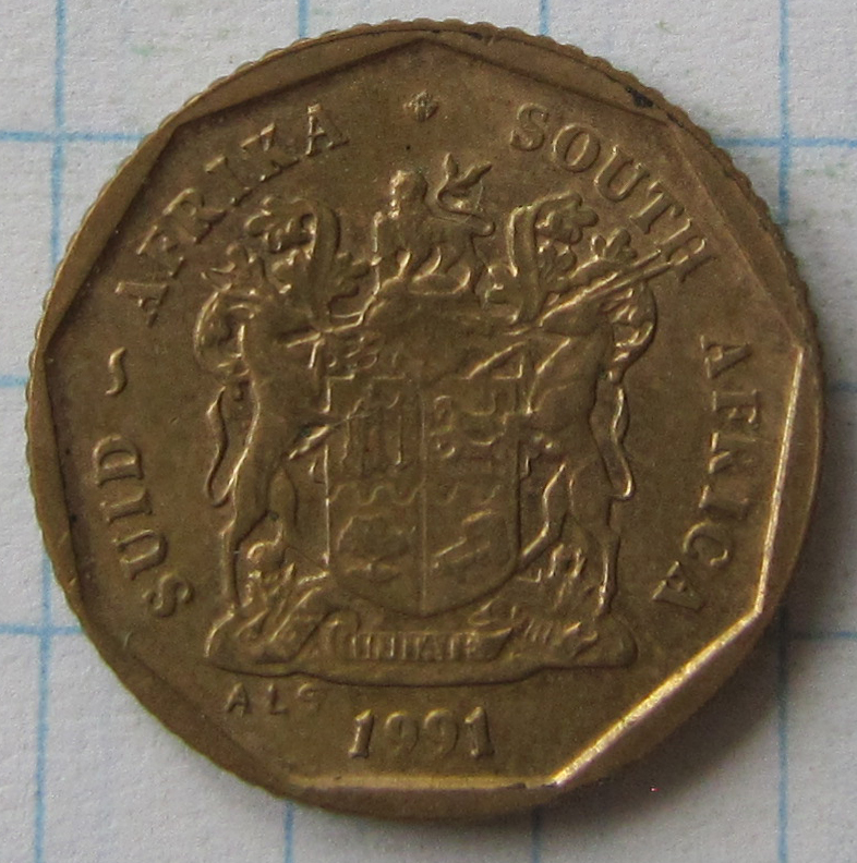 Реверс:герб ЮАР образца 1932-2000гг. Название страны на языке африкаанс SUID-AFRIKA и на английском языке SOUTH AFRICA. Снизу - год чеканки монеты.