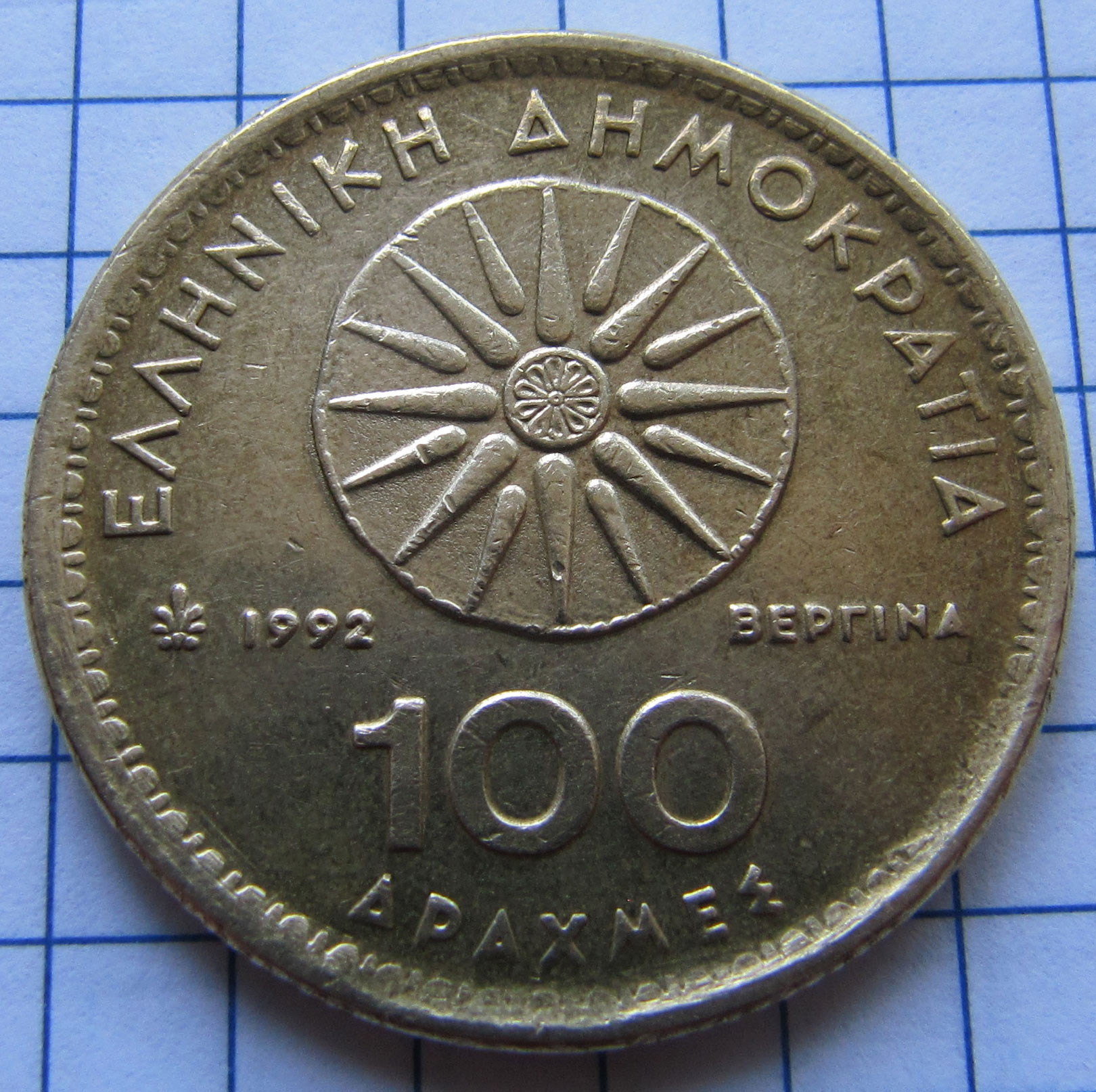 Аверс:надпись на греческом сверху "ΕΛΛΗΝΙΚΗ ΔΗΜΟΚΡΑΤΙΑ" (Греческая Республика), ниже изображена "Вергинская звезда" (символ Древней Македонии), слева указан год чеканки, справа надпись на греческом "ВЕРГINA" (Вергина), ниже указан номинал 100 ΔΡΑΧΜΕΣ.