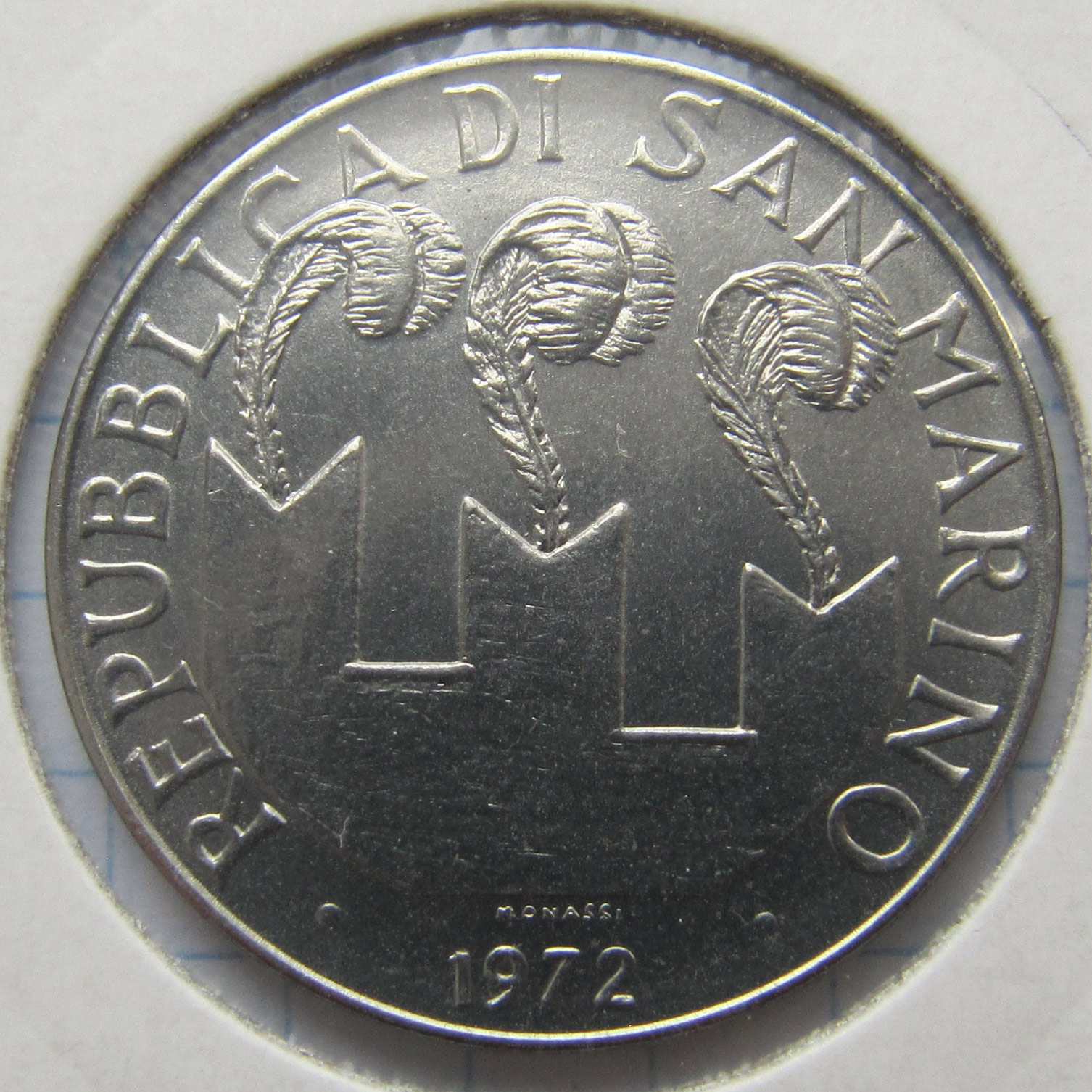 Реверс:символ страны (три крепостные башни со страусиными перьями), под ними - год чеканки монеты. По кругу надпись: REPUBBLICA DI SAN MARINO.