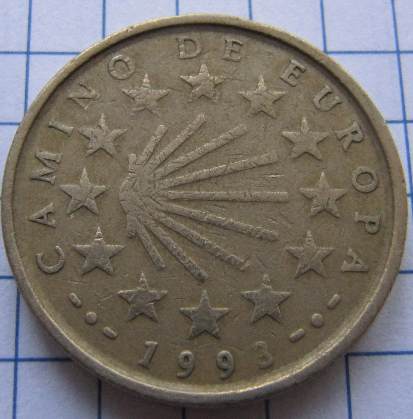 Аверс:номинал 100 PESETAS, на карте путь Святого Иакова. Эль Камино де Сантьяго - знаменитая паломническая дорога к могиле апостола Иакова в испанском городе Сантьяго-де-Компостела.