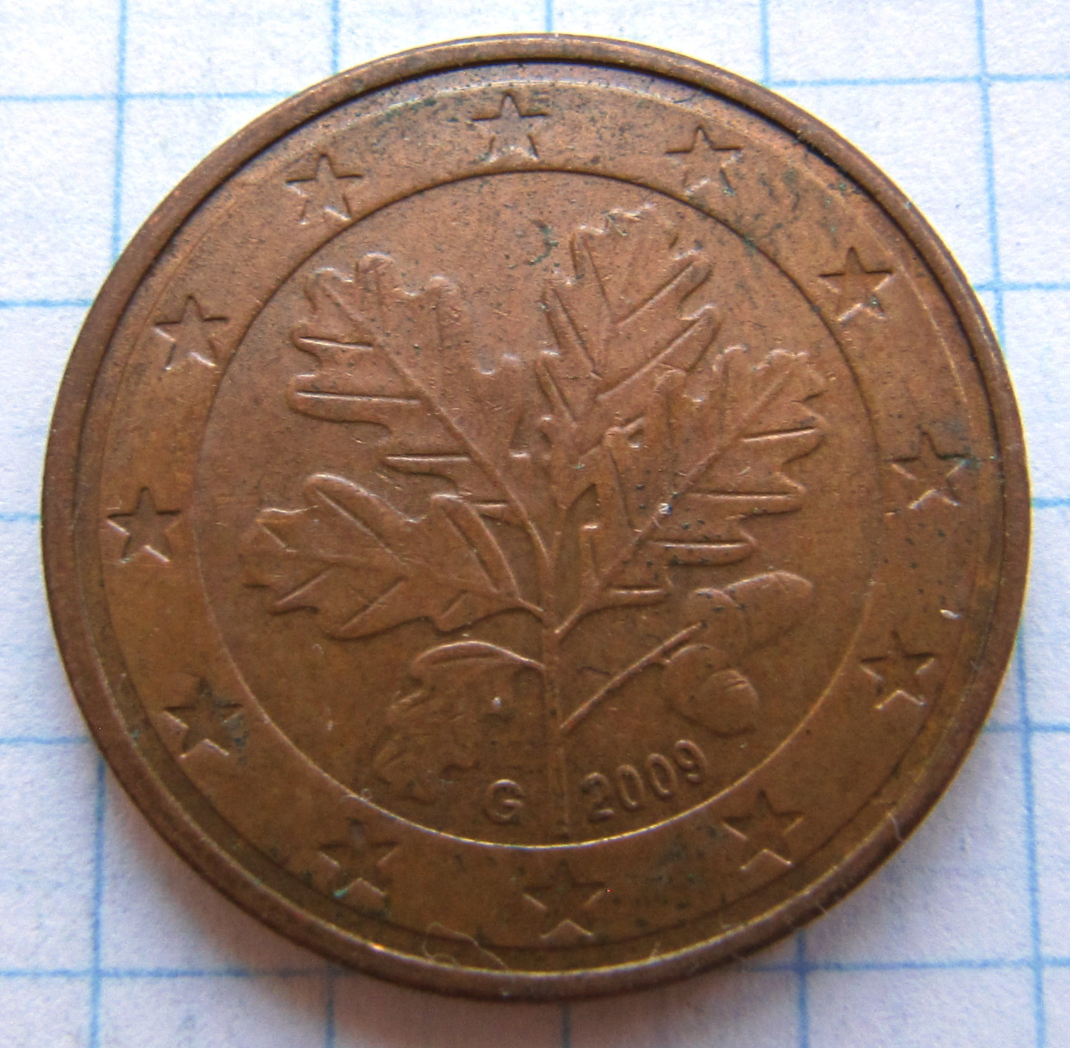 Реверс:ветка дуба с желудями, считавшегося священным деревом у многих древних народов, в т.ч. германцев; практически без изменений перенесено с разменной монеты Германии – пфеннига. Под веткой – буква G (чекан Карлсруэ) и год чеканки. По кругу 12 звезд.