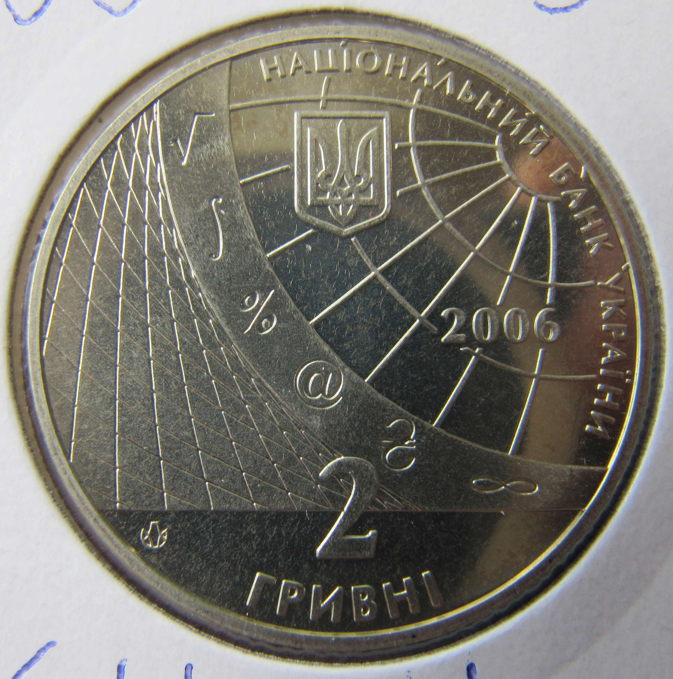 Аверс:композиция из линий-меридианов, которые символично воспроизводят динамику современных мировых экономических процессов, международные математические знаки и знак гривны. Сверху надпись: НАЦІОНАЛЬНИЙ БАНК УКРАЇНИ, под ней - малый Государственный Герб Украины, справа - год чеканки монеты, снизу номинал 2 ГРИВНІ и логотип Монетного двора Национального банка Украины.