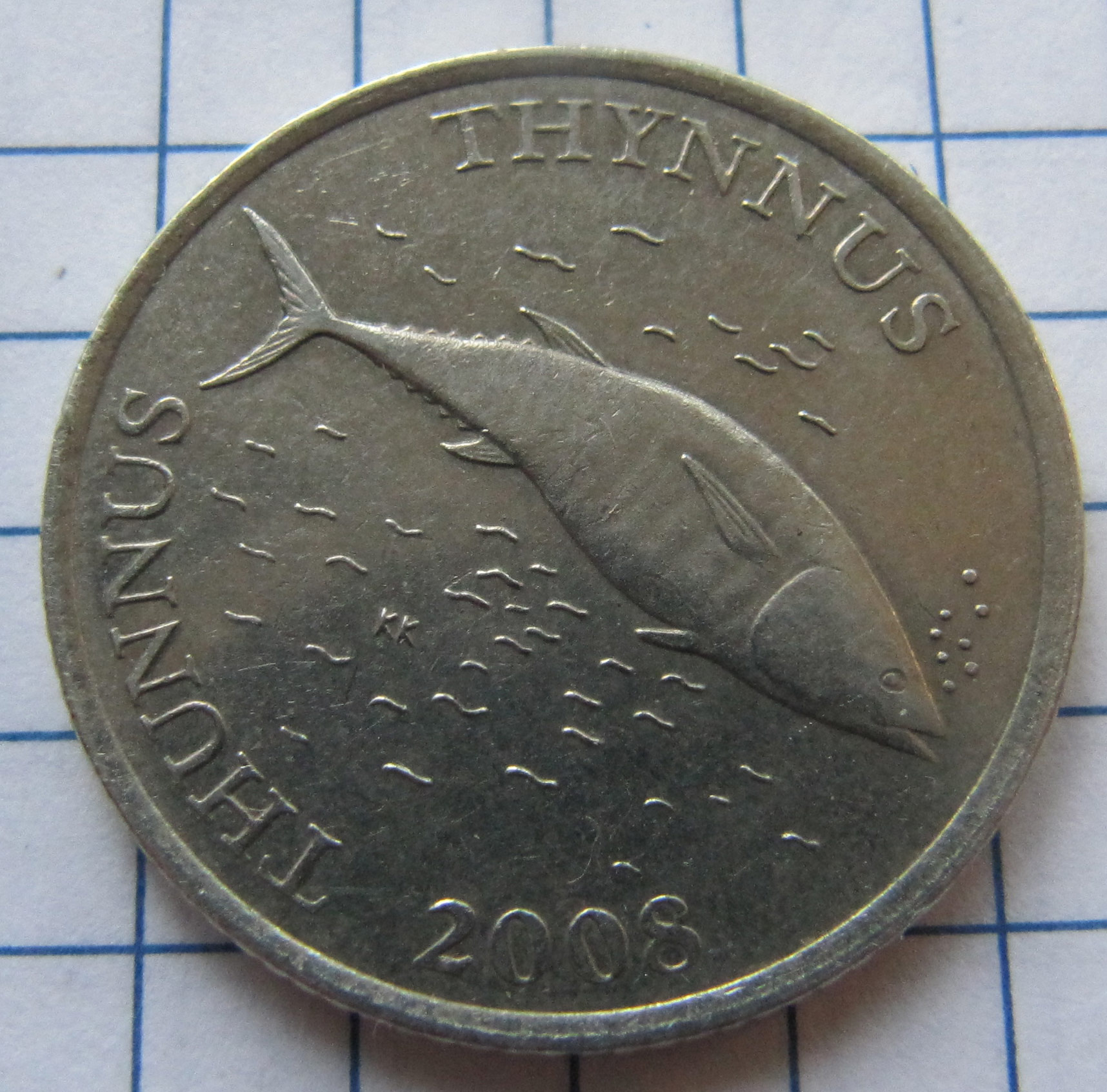 в центре тунец обыкновенный, снизу год чеканки, по кругу на латыни: THUNNUS THYNNUS.