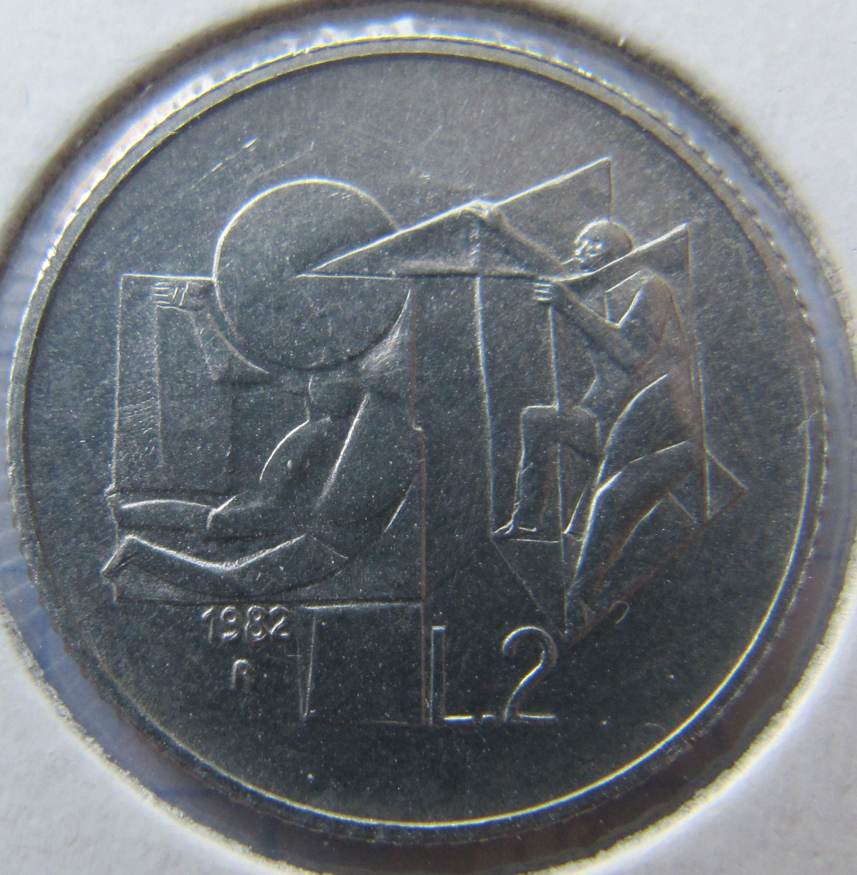 Аверс:абстрактная композиция из человеческих тел и геометрических фигур, внизу - номинал L.2 и год чеканки монеты.