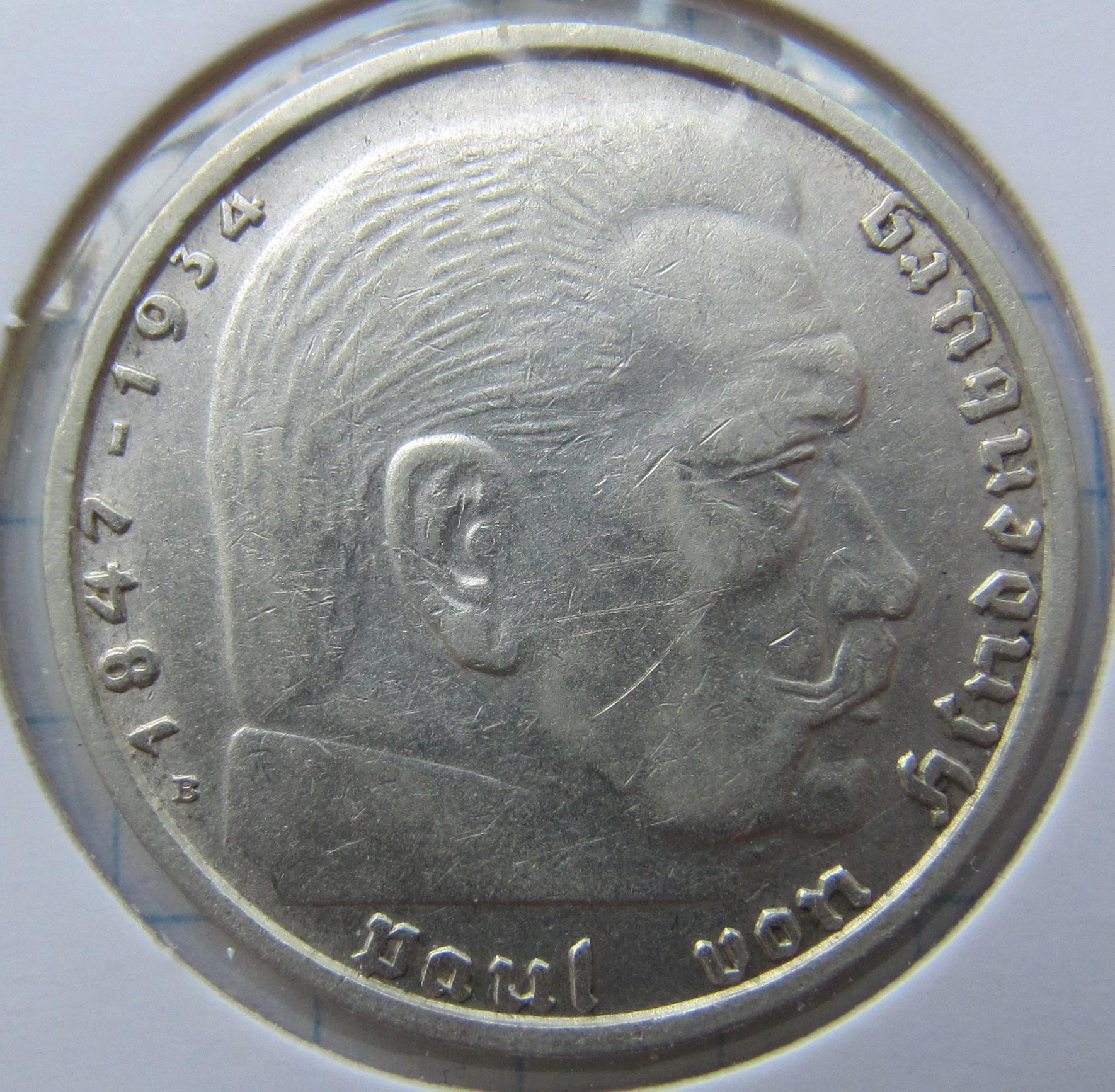 Аверс:орел с распростертыми крыльями держит в лапах стилизованный дубовый венок со свастикой в центре. С двух сторон расположен номинал монеты 2 Reichsmark, снизу по кругу надпись: DEUTSCHES REICH (Германская империя) и год чеканки монеты.