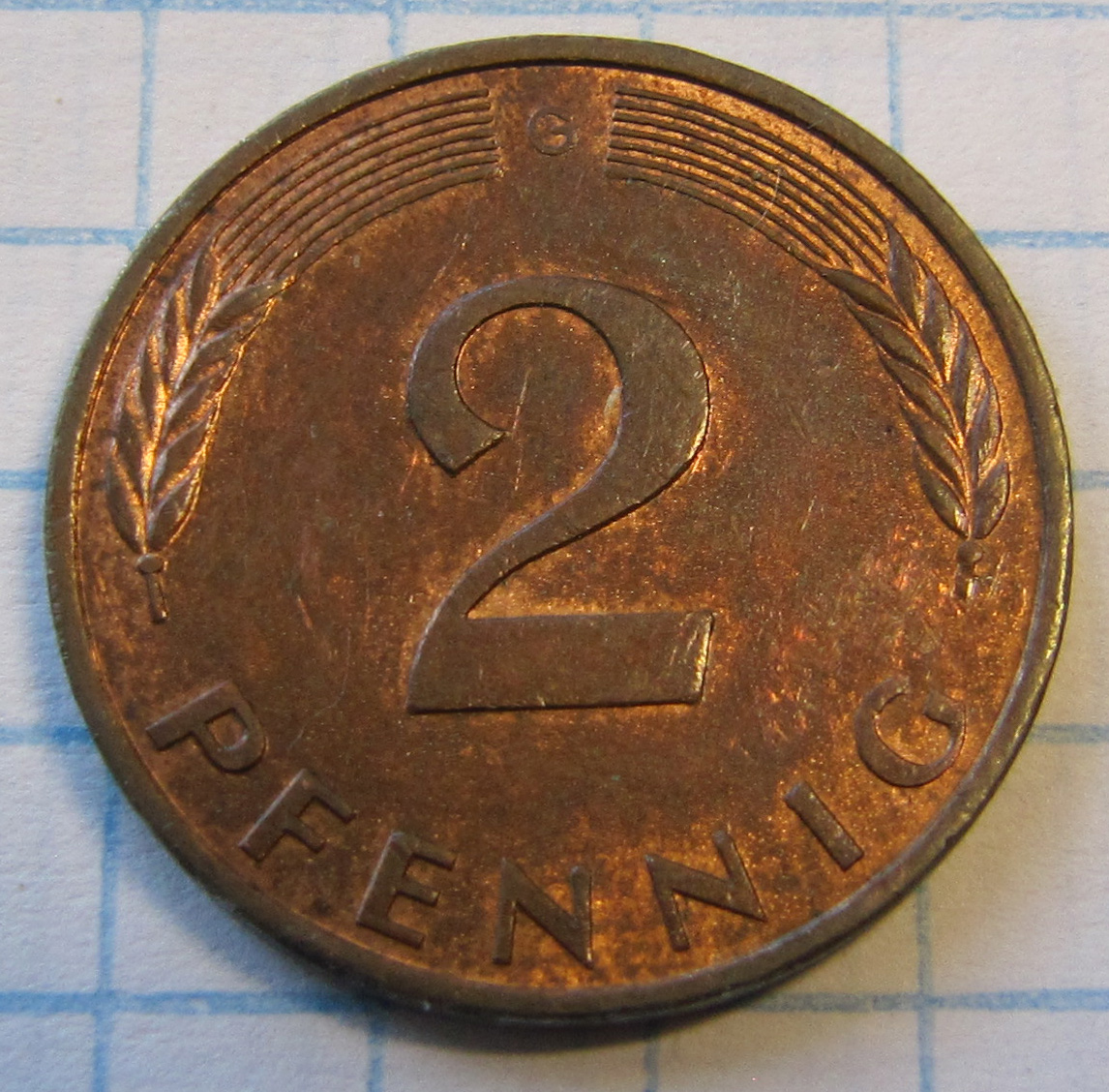 Аверс:в центре номинал 2 PFENNIG, по бокам два колоска, вверху монеты литера обозначающая монетный двор.