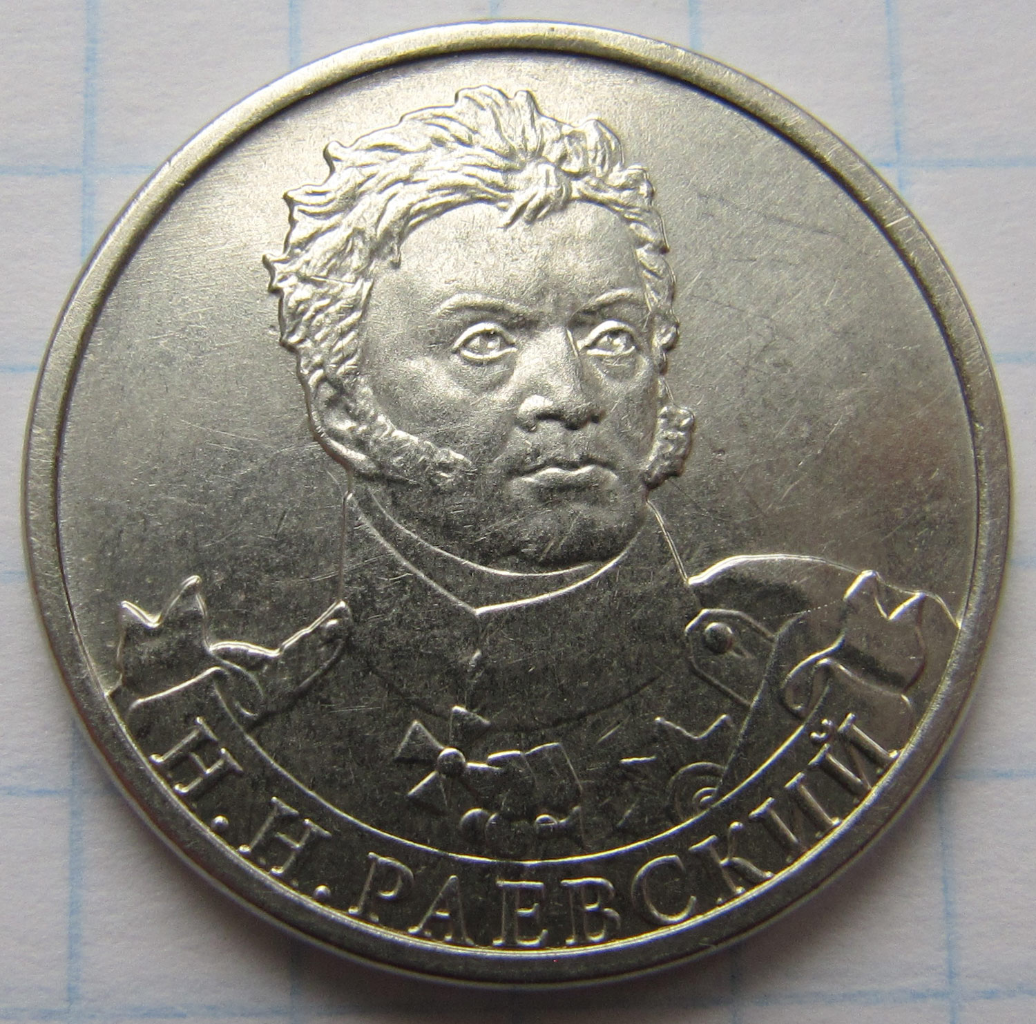 Реверс:погрудный рельефный портрет Н.Н. Раевского в военном мундире, внизу у канта на широкой ленте — надпись: «Н.Н. РАЕВСКИЙ».