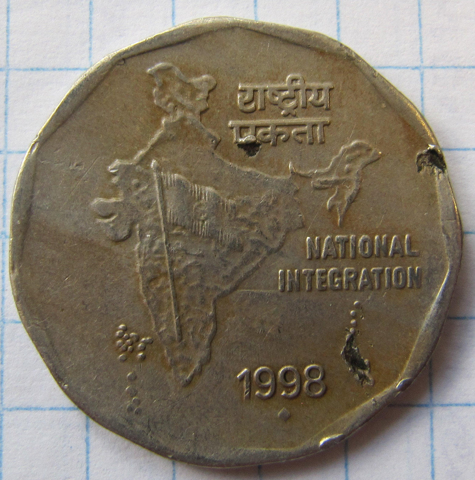 флаг Республики на фоне карты Индии. Сверху надпись на Хинди, справа на английском: NATIONAL INTEGRATION. Снизу - год чеканки монеты и ◆ (знак монетного двора).