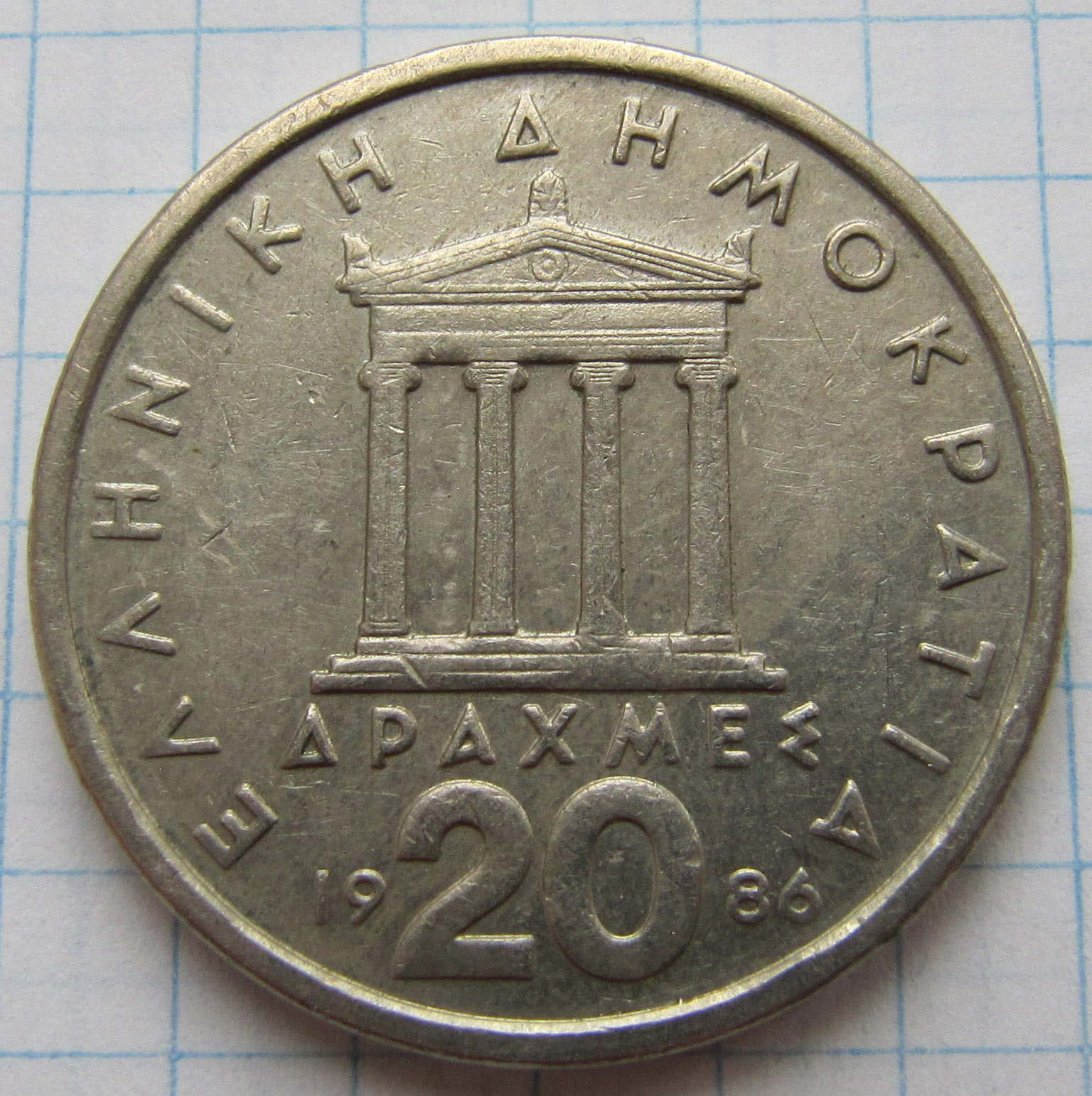 Аверс:Парфенон, внизу указан номинал 20 ΔΡΑΧΜΕΣ и год чеканки монеты. По кругу надпись: ΕΛΛΗΝΙΚΗ ΔΗΜΟΚΡΑΤΙΑ (Греческая Республика).