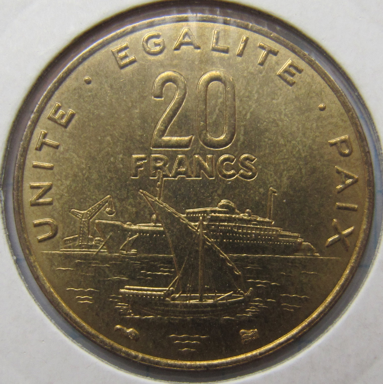 Аверс:летка проа на тлі пасажирського теплохода та портового крана. Зверху - номінал 20 FRANCS та напис по колу: UNITE · EGALITE · PAIX (ЄДНІСТЬ, РІВНІСТЬ, СВІТ).