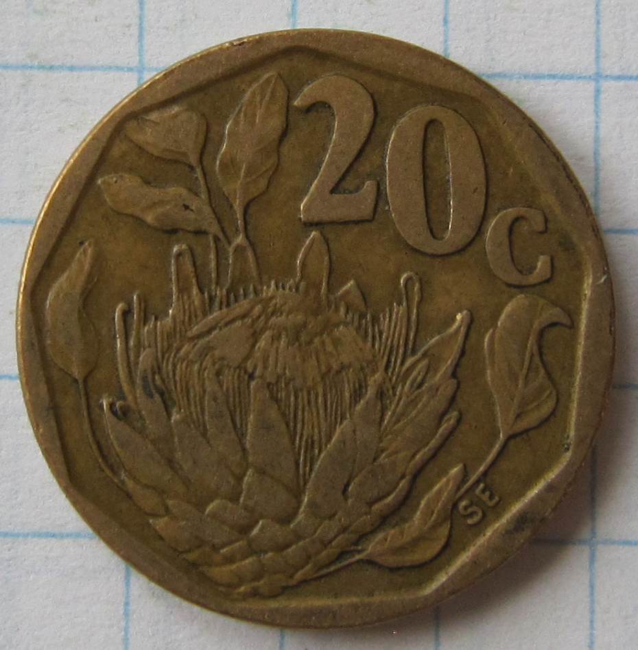 Аверс:номинал 20с и цветок королевской протеи, одного из национальных символов ЮАР.