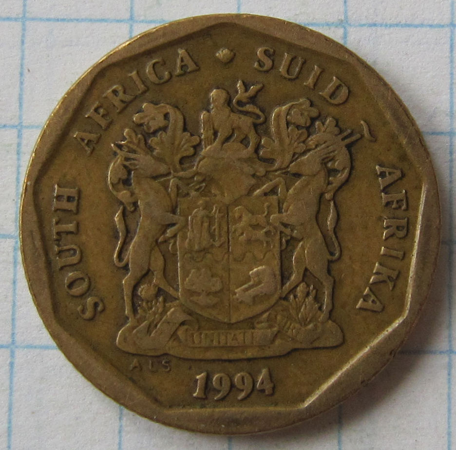 Реверс:герб ЮАР образца 1932-2000гг. Название страны на английском SOUTH AFRICA и на языке африкаанс SUID-AFRIKA. Снизу - год чеканки монеты.
