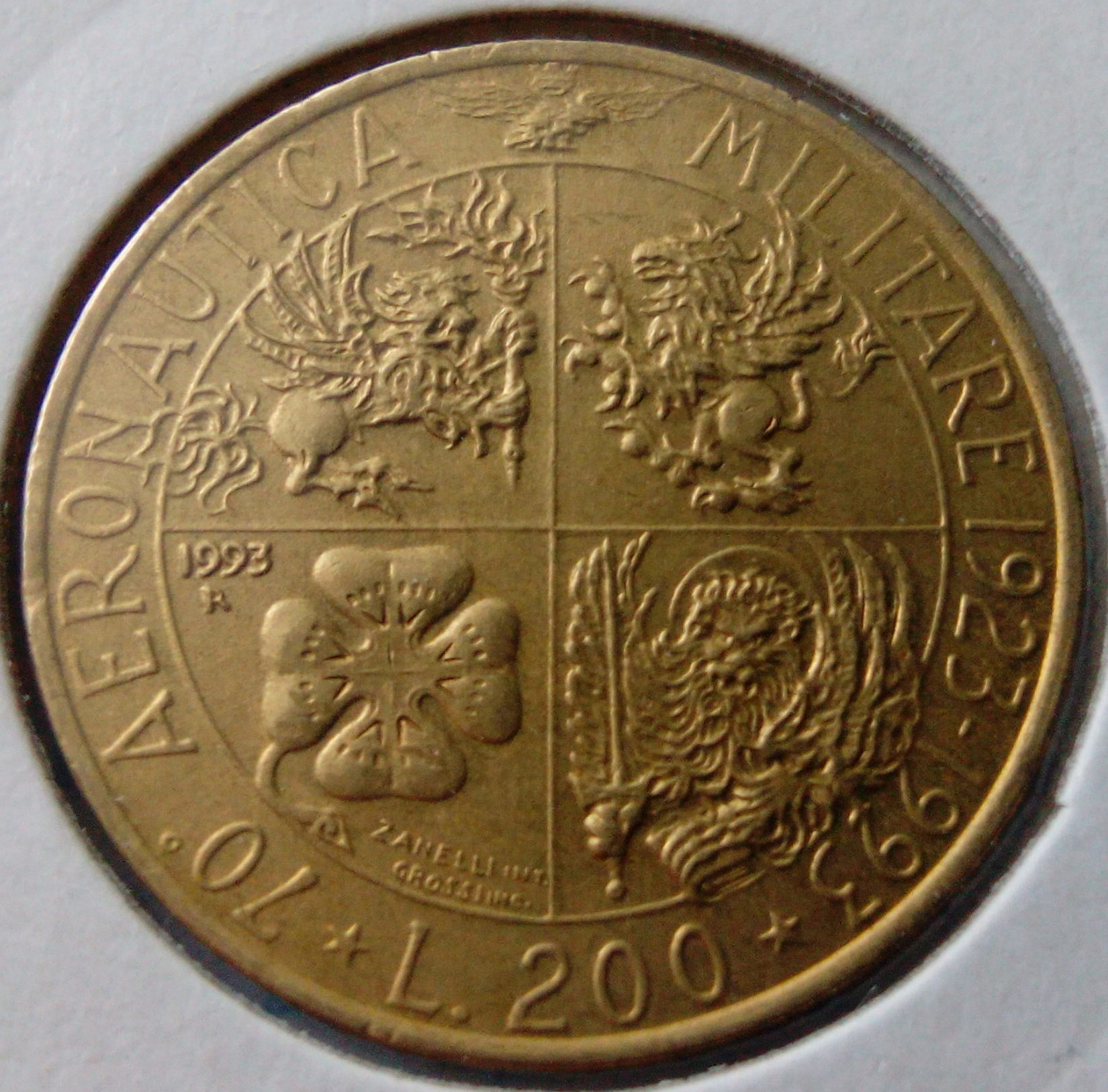 В центре герб Военно-Воздушных Сил Италии, снизу номинал L.200, по кругу надпись: 70 AERONAUTICA MILITARE и годы.