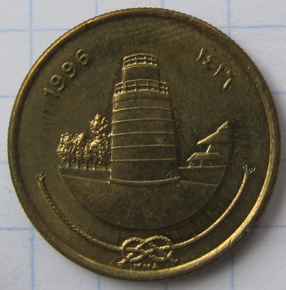 в центре – изображение Пятничной мечети с минаретом, внизу – канат, завязанный морским узлом. В верхней части монеты полукругом год чеканки по Григорианскому стилю и по Хиджре.